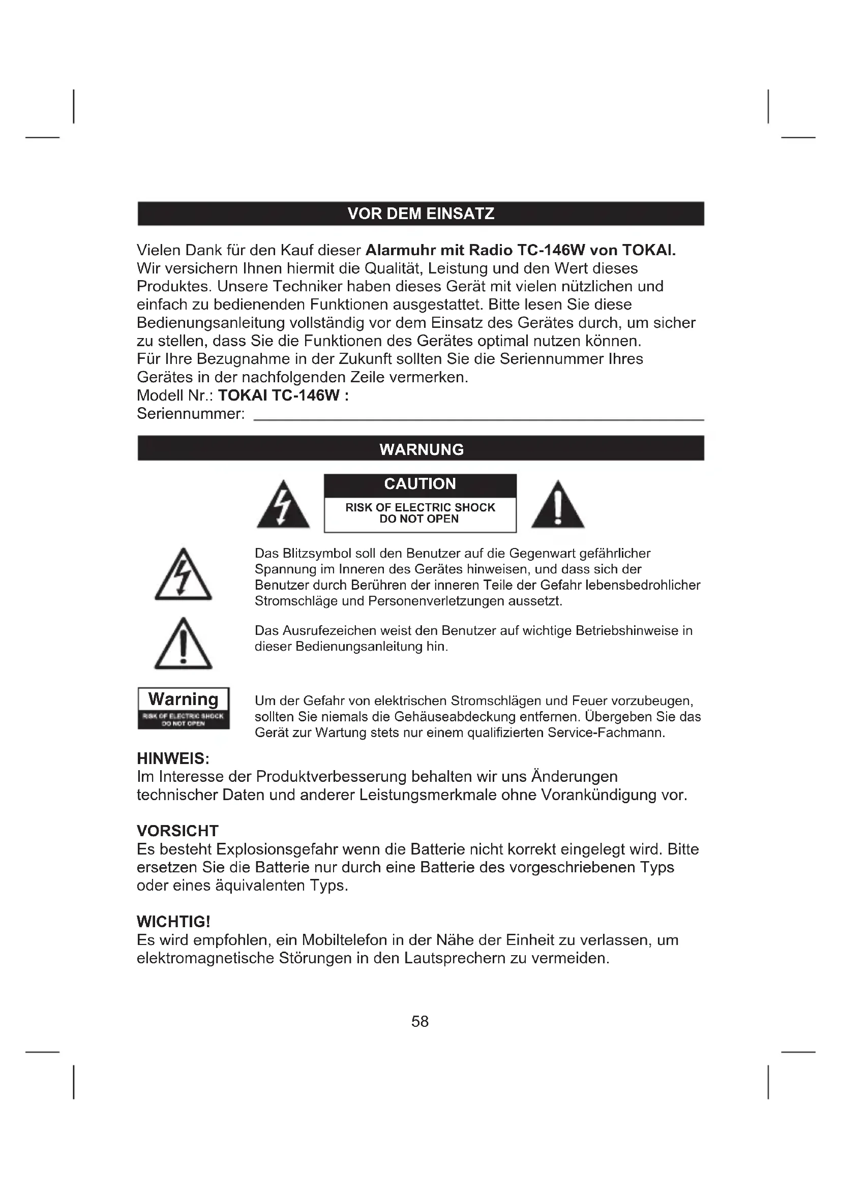 Laden Sie die Anleitung für Ihr Radiowecker kostenlos im PDF-Format! Finden Sie Ihr Handbuch TC146W - TOKAI und nehmen Sie Ihr elektronisches Gerät wieder in die Hand. Auf dieser Seite sind alle Dokumente veröffentlicht, die für die Verwendung Ihres Geräts notwendig sind. TC146W von der Marke TOKAI.