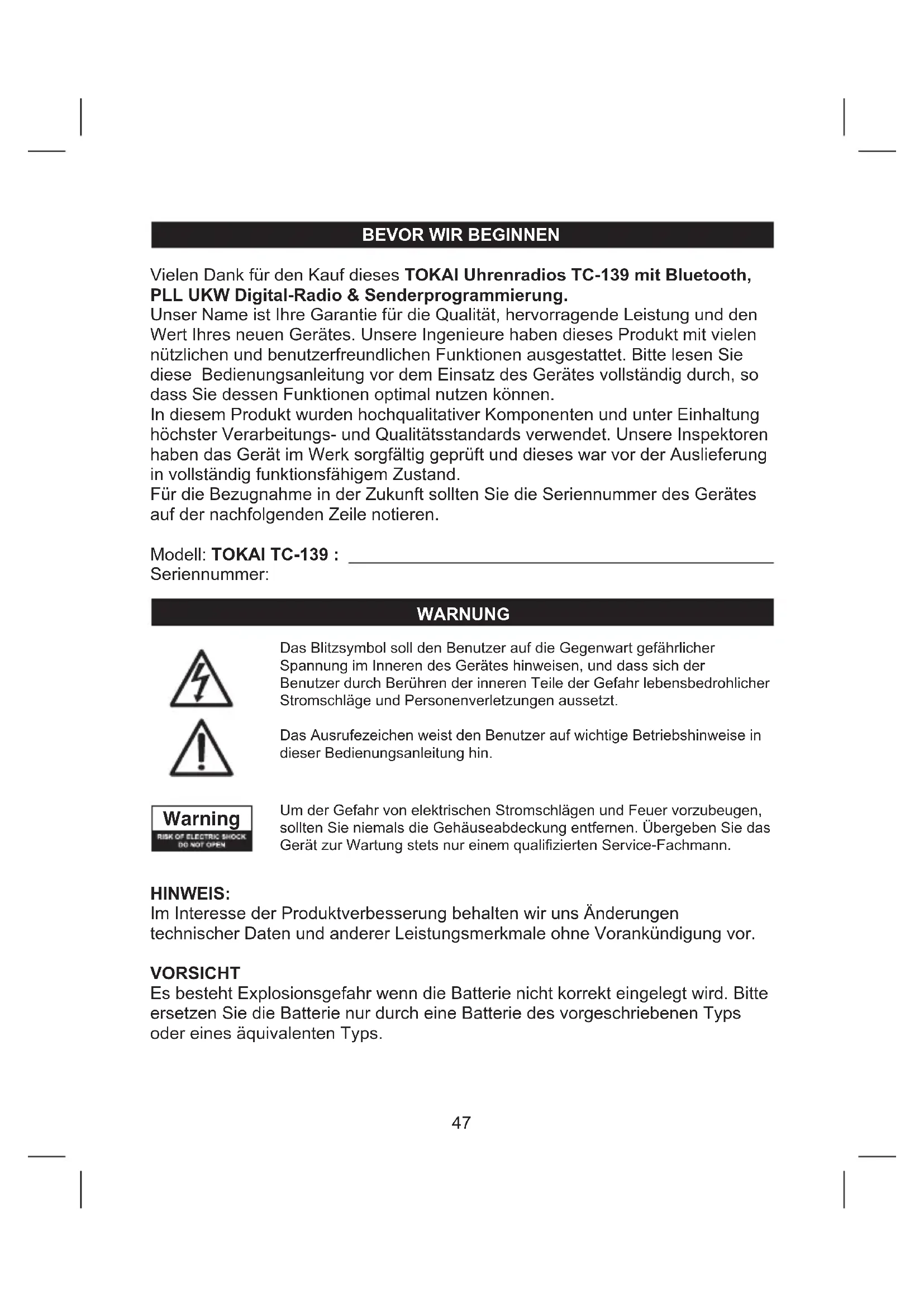 BEDIENUNGSANLEITUNG TC139 TOKAI