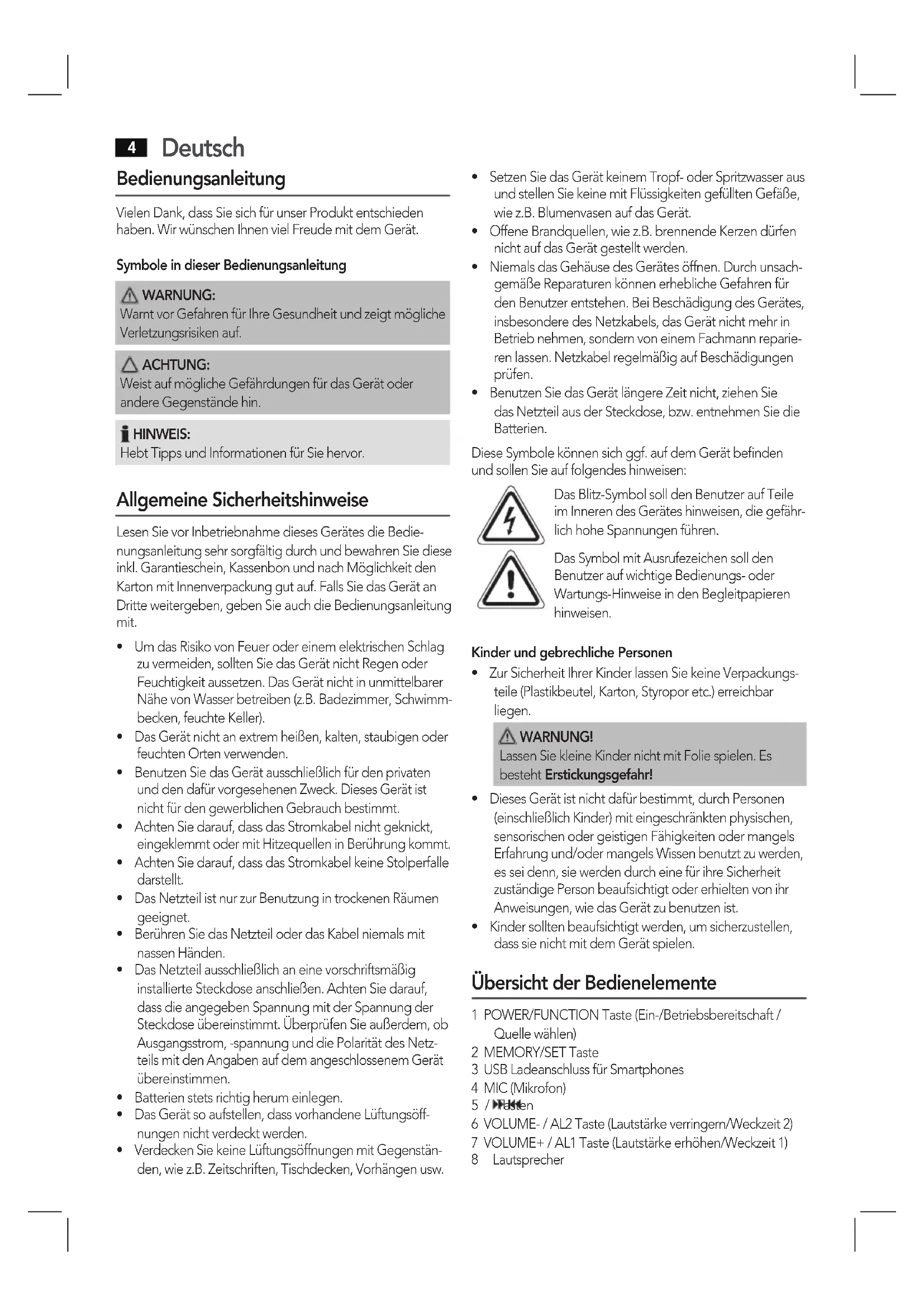 - Kindersolltenbeaufsichtigtwerden,umsicherzustellen, dass sie nicht mit dem Gerät spielen. Übersicht der Bedienelemente 1 POWER/FUNCTION Taste (Ein-/Betriebsbereitschaft / Quelle wählen) 2 MEMORY/SET Taste 3 USB Ladeanschluss für Smartphones 4 MIC (Mikrofon) 5 / Tasten 6 VOLUME- / AL2 Taste (Lautstärke verringern/Weckzeit 2) 7 VOLUME+ / AL1 Taste (Lautstärke erhöhen/Weckzeit 1) 8 LautsprecherDeutsch