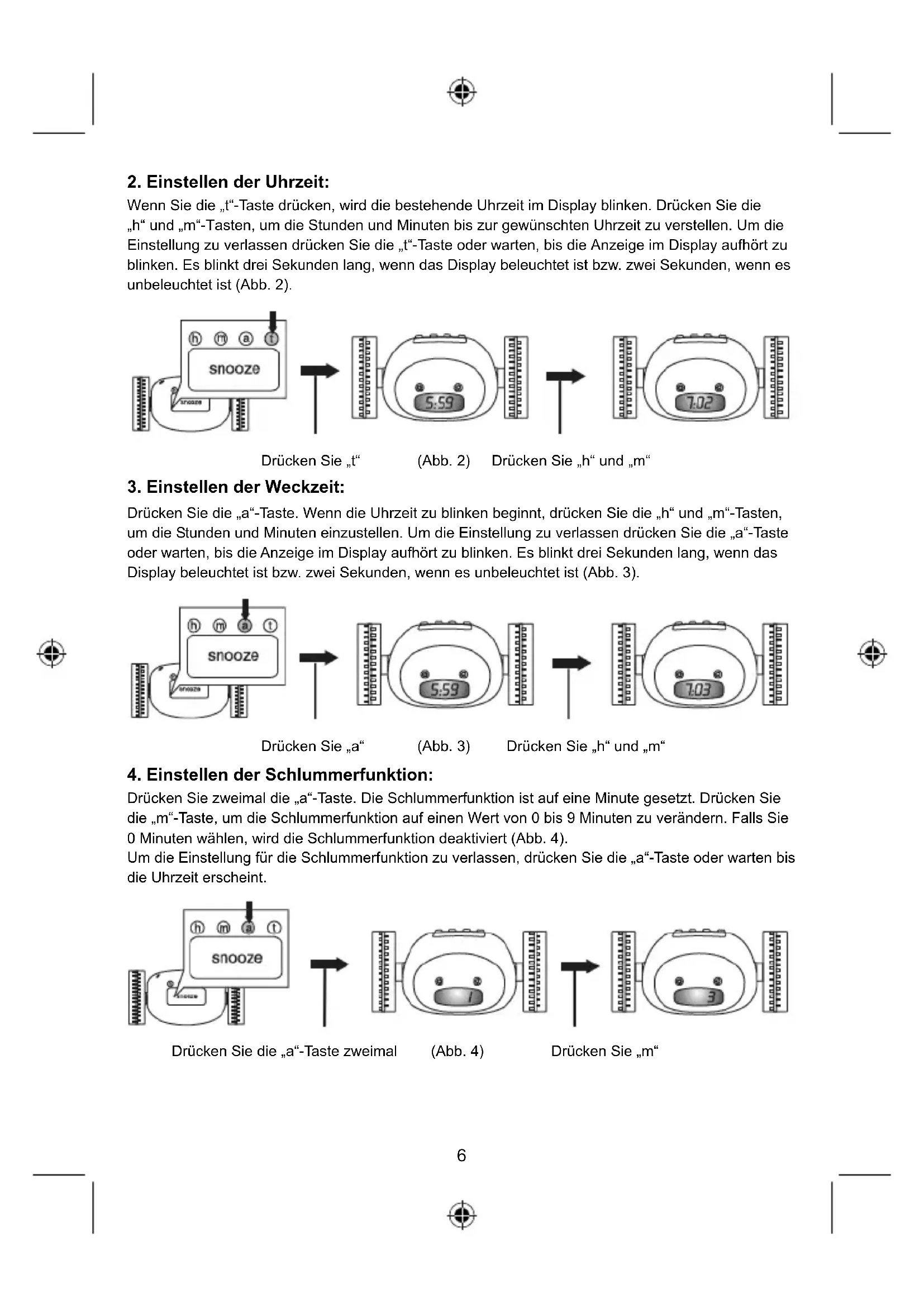 snooze Drücken Sie die „a“-Taste zweimal (Abb. 4) Drücken Sie „m“5. Aktivieren der Weckzeit: