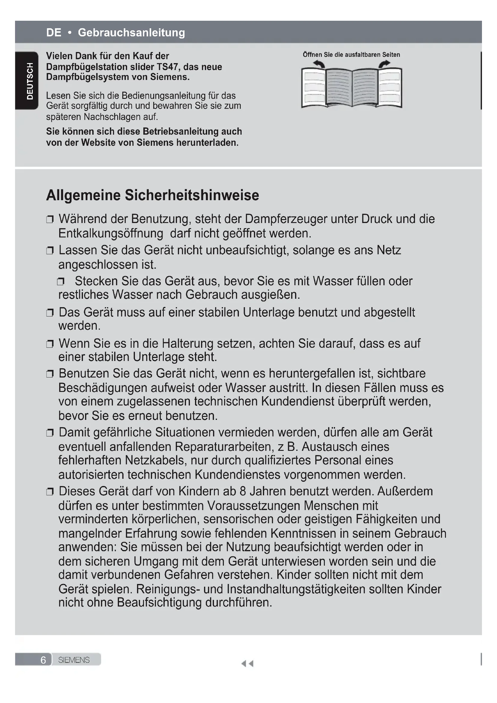 S I E M E N S deutsCH Vielen Dank für den Kauf der Dampfbügelstation slider TS47, das neue Dampfbügelsystem von Siemens. Lesen Sie sich die Bedienungsanleitung für das Gerät sorgfältig durch und bewahren Sie sie zum späteren Nachschlagen auf. Sie können sich diese Betriebsanleitung auch von der Website von Siemens herunterladen. Öffnen Sie die ausfaltbaren Seiten Allgemeine Sicherheitshinweise ❐ Während der Benutzung, steht der Dampferzeuger unter Druck und die Entkalkungsöffnung darf nicht geöffnet werden. ❐ Lassen Sie das Gerät nicht unbeaufsichtigt, solange es ans Netz angeschlossen ist. ❐ Stecken Sie das Gerät aus, bevor Sie es mit Wasser füllen oder restliches Wasser nach Gebrauch ausgießen. ❐ Das Gerät muss auf einer stabilen Unterlage benutzt und abgestellt werden. ❐ Wenn Sie es in die Halterung setzen, achten Sie darauf, dass es auf einer stabilen Unterlage steht. ❐ Benutzen Sie das Gerät nicht, wenn es heruntergefallen ist, sichtbare Beschädigungen aufweist oder Wasser austritt. In diesen Fällen muss es von einem zugelassenen technischen Kundendienst überprüft werden, bevor Sie es erneut benutzen. ❐ Damit gefährliche Situationen vermieden werden, dürfen alle am Gerät eventuell anfallenden Reparaturarbeiten, z B. Austausch eines fehlerhaften Netzkabels, nur durch qualiziertes Personal eines autorisierten technischen Kundendienstes vorgenommen werden. ❐ Dieses Gerät darf von Kindern ab 8 Jahren benutzt werden. Außerdem dürfen es unter bestimmten Voraussetzungen Menschen mit verminderten körperlichen, sensorischen oder geistigen Fähigkeiten und mangelnder Erfahrung sowie fehlenden Kenntnissen in seinem Gebrauch anwenden: Sie müssen bei der Nutzung beaufsichtigt werden oder in dem sicheren Umgang mit dem Gerät unterwiesen worden sein und die damit verbundenen Gefahren verstehen. Kinder sollten nicht mit dem Gerät spielen. Reinigungs- und Instandhaltungstätigkeiten sollten Kinder nicht ohne Beaufsichtigung durchführen.7 S I E M E N S deutsCH ❐ Halten Sie das Bügeleisen und sein Kabel fern von Kindern unter 8 Jahren, wenn es an eine Stromquelle angeschlossen ist oder noch abkühlt. ❐ Dieses Gerät ist nur ausgelegt für Haushalte bis 2000m über dem Meeresspiegel. ❐ VORSICHT! Heiße Oberäche. Die Oberäche wird bei der Benutzung heiß.