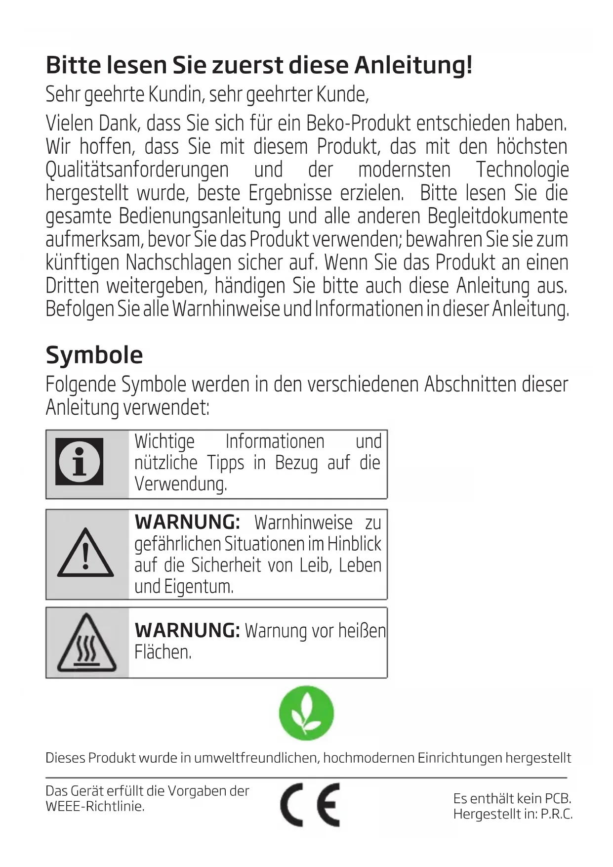 WARNUNG: Warnhinweise zu gefährlichen Situationen im Hinblick auf die Sicherheit von Leib, Leben und Eigentum. WARNUNG: Warnung vor heißen Flächen. Es enthält ken PCB.Das Gerät erfüllt de Vorgaben der WEEE-Rchtlne.Deses Produkt wurde n umweltfreundlchen, hochmodernen Enrchtungen hergestellt Hergestellt n: P.R.C.17 / 139 DE Bügeleisen / Bedienungsanleitung INHALT 1 Wichtige Anweisungen zu Sicherheit und Umwelt 18-22
