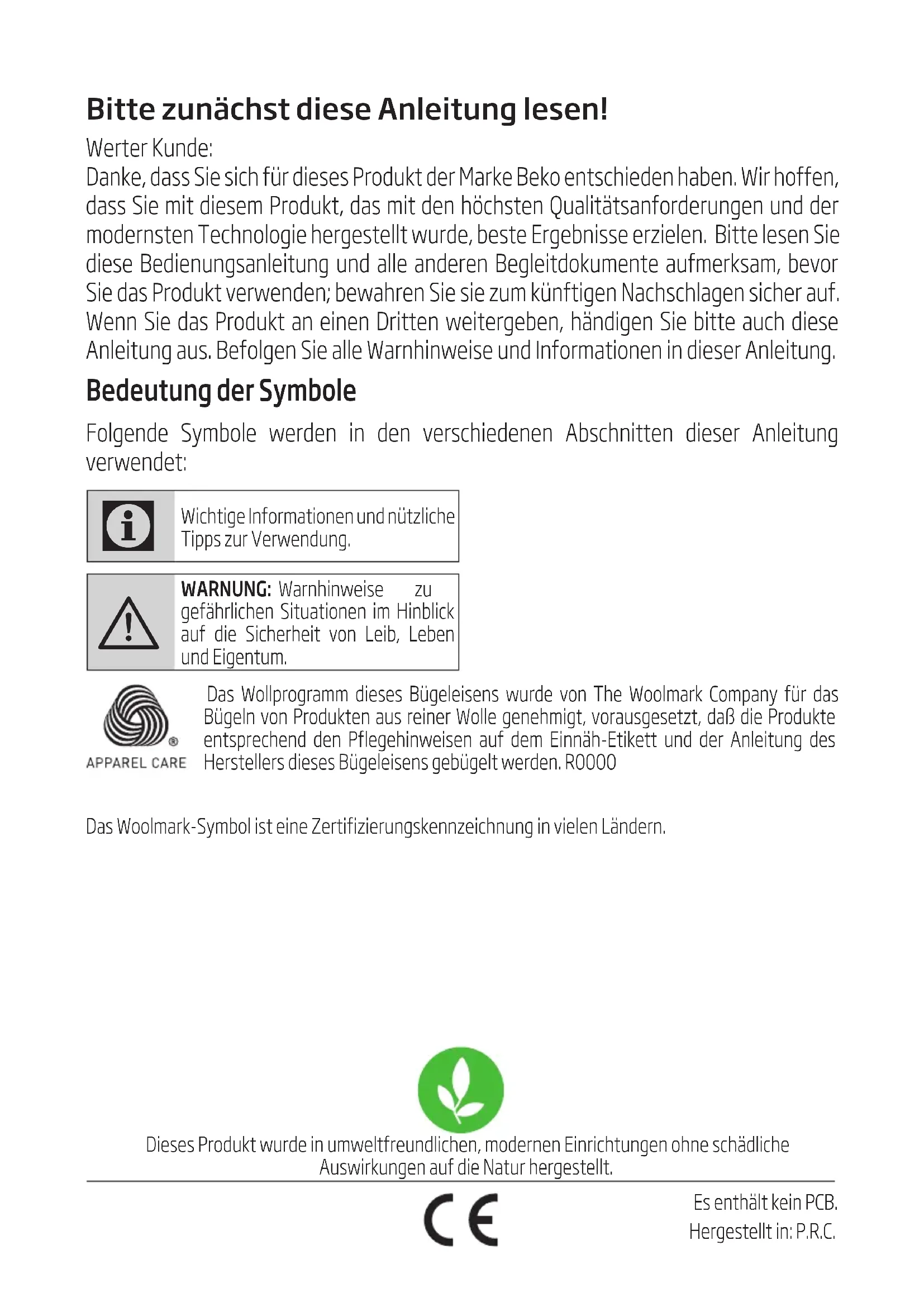 WARNUNG: Warnhinweise zu gefährlichen Situationen im Hinblick auf die Sicherheit von Leib, Leben und Eigentum. Das Wollprogramm deses Bügelesens wurde von The Woolmark Company für das Bügeln von Produkten aus rener Wolle genehmgt, vorausgesetzt, daß de Produkte entsprechend den Pflegehnwesen auf dem Ennäh-Etkett und der Anletung des Herstellers deses Bügelesens gebügelt werden. R0000 Das Woolmark-Symbol st ene Zertfzerungskennzechnung n velen Ländern. Dieses Produkt wurde in umweltfreundlichen, modernen Einrichtungen ohne schädliche Auswirkungen auf die Natur hergestellt. Es enthält kein PCB. Hergestellt in: P.R.C.Dampfstation / Bedienungsanleitung 15 / DE Deser Abschntt enthält Scherhetsanwesungen, de bem Schutz vor Personen- und Sachschäden helfen. Be Nchtbeachtung deser Anwesungen erlscht de gewährte Garante.