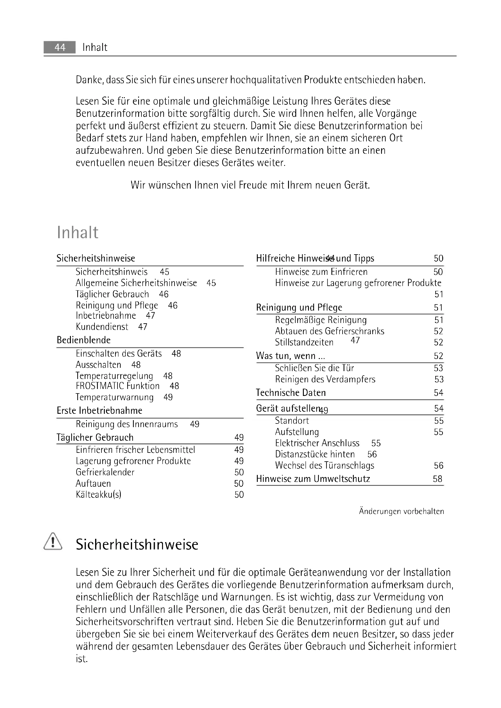 Reinigung und Pflege 51 Regelmäßige Reinigung 51 Abtauen des Gefrierschranks 52 Stillstandzeiten 52 Was tun, wenn … 52 Schließen Sie die Tür 53 Reinigen des Verdampfers 53 Technische Daten 54 Gerät aufstellen 54 Standort 55 Aufstellung 55 Elektrischer Anschluss 55 Distanzstücke hinten 56 Wechsel des Türanschlags 56 Hinweise zum Umweltschutz 58 Änderungen vorbehalten Sicherheitshinweise Lesen Sie zu Ihrer Sicherheit und für die optimale Geräteanwendung vor der Installation und dem Gebrauch des Gerätes die vorliegende Benutzerinformation aufmerksam durch, einschließlich der Ratschläge und Warnungen. Es ist wichtig, dass zur Vermeidung von Fehlern und Unfällen alle Personen, die das Gerät benutzen, mit der Bedienung und den Sicherheitsvorschriften vertraut sind. Heben Sie die Benutzerinformation gut auf und übergeben Sie sie bei einem Weiterverkauf des Gerätes dem neuen Besitzer, so dass jeder während der gesamten Lebensdauer des Gerätes über Gebrauch und Sicherheit informiert ist.