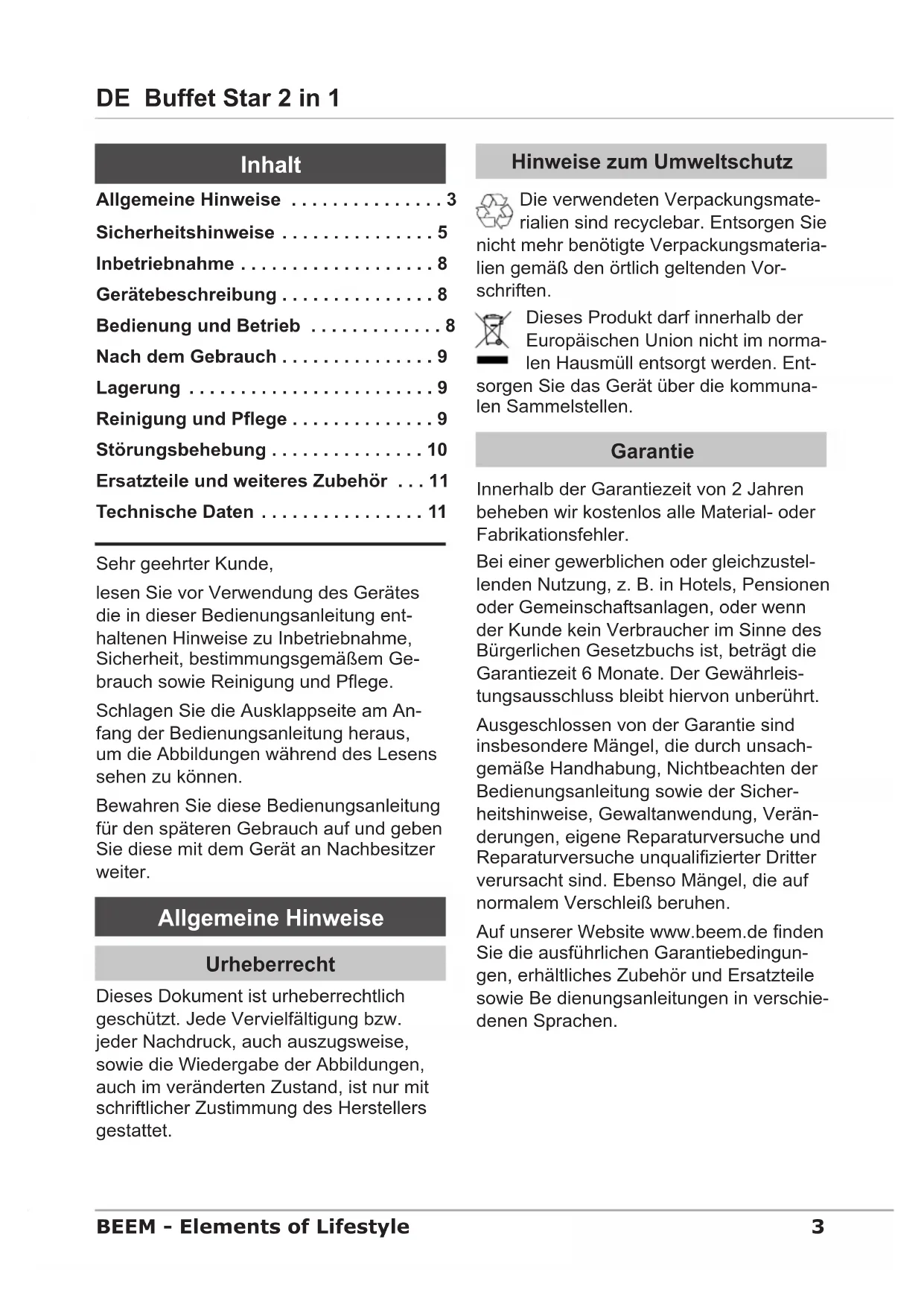 BEDIENUNGSANLEITUNG Buffet Star 2 in 1 BEEM