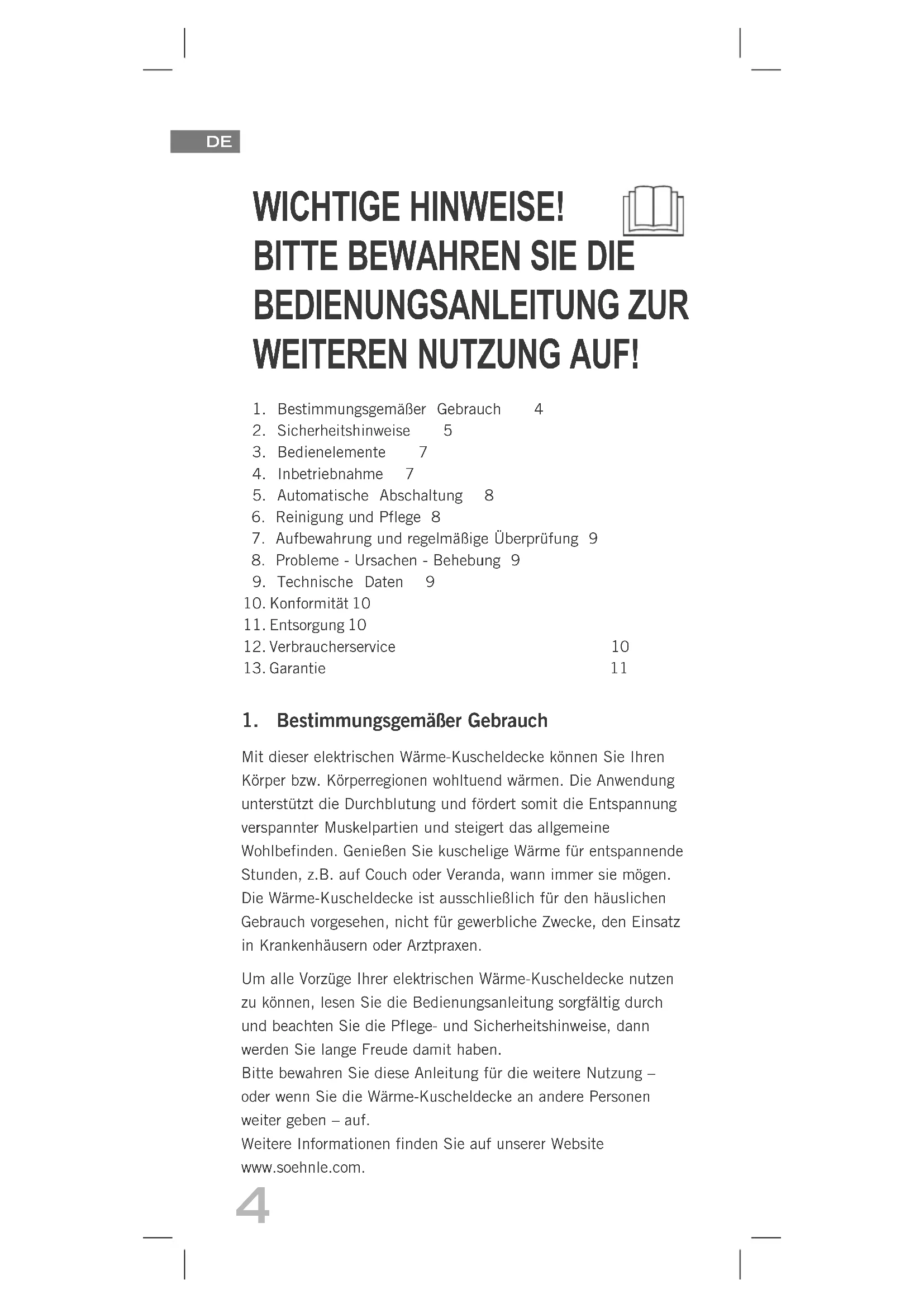 Bitte bewahren Sie diese Anleitung für die weitere Nutzung – oder wenn Sie die Wärme-Kuscheldecke an andere Personen weiter geben – auf.