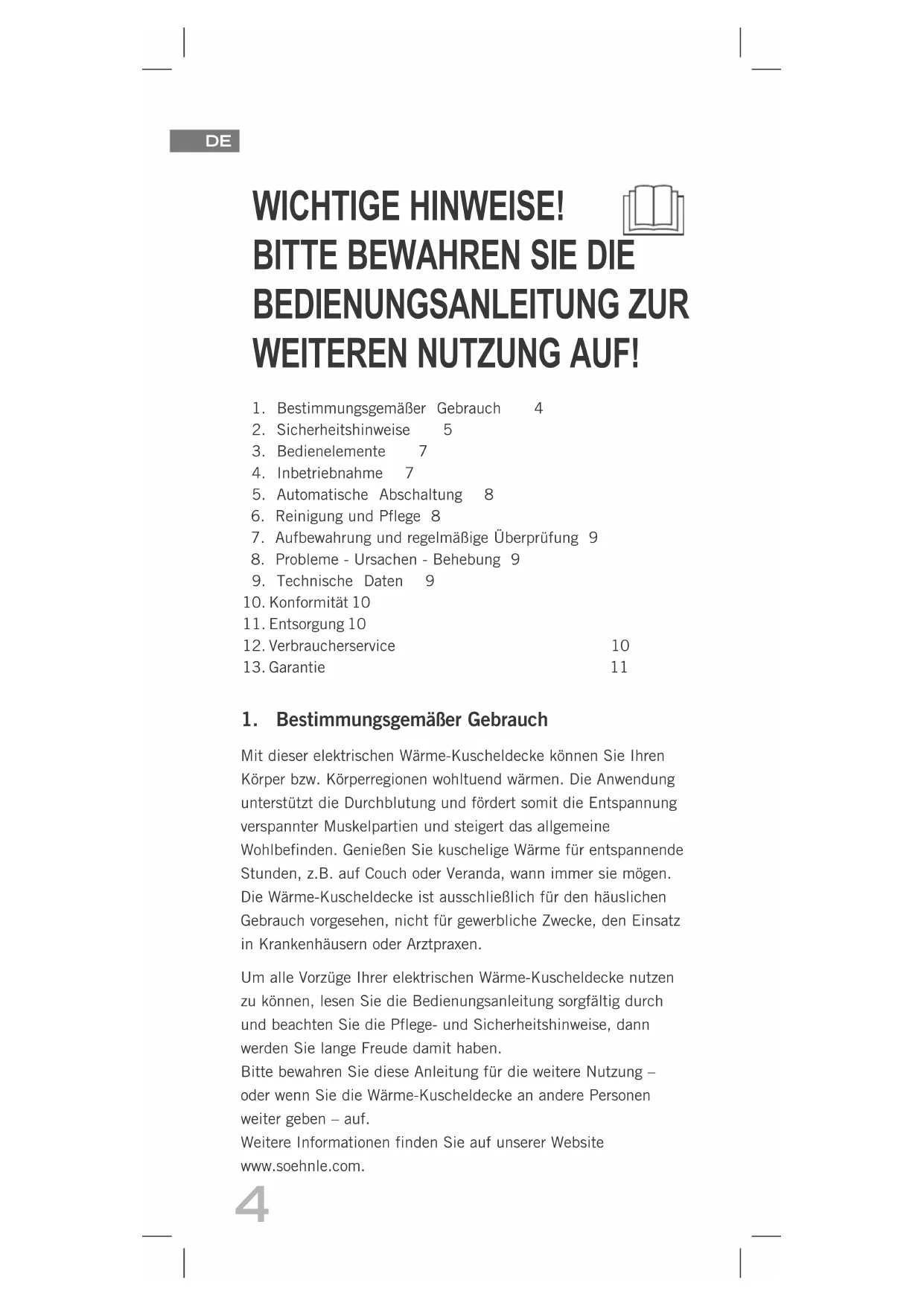 Bittle bewahren Sie diese Anleitung für die weitere Nutzung – oder wenn Sie die Wärme-Kuscheldecke an andere Personen weiter geben – auf.