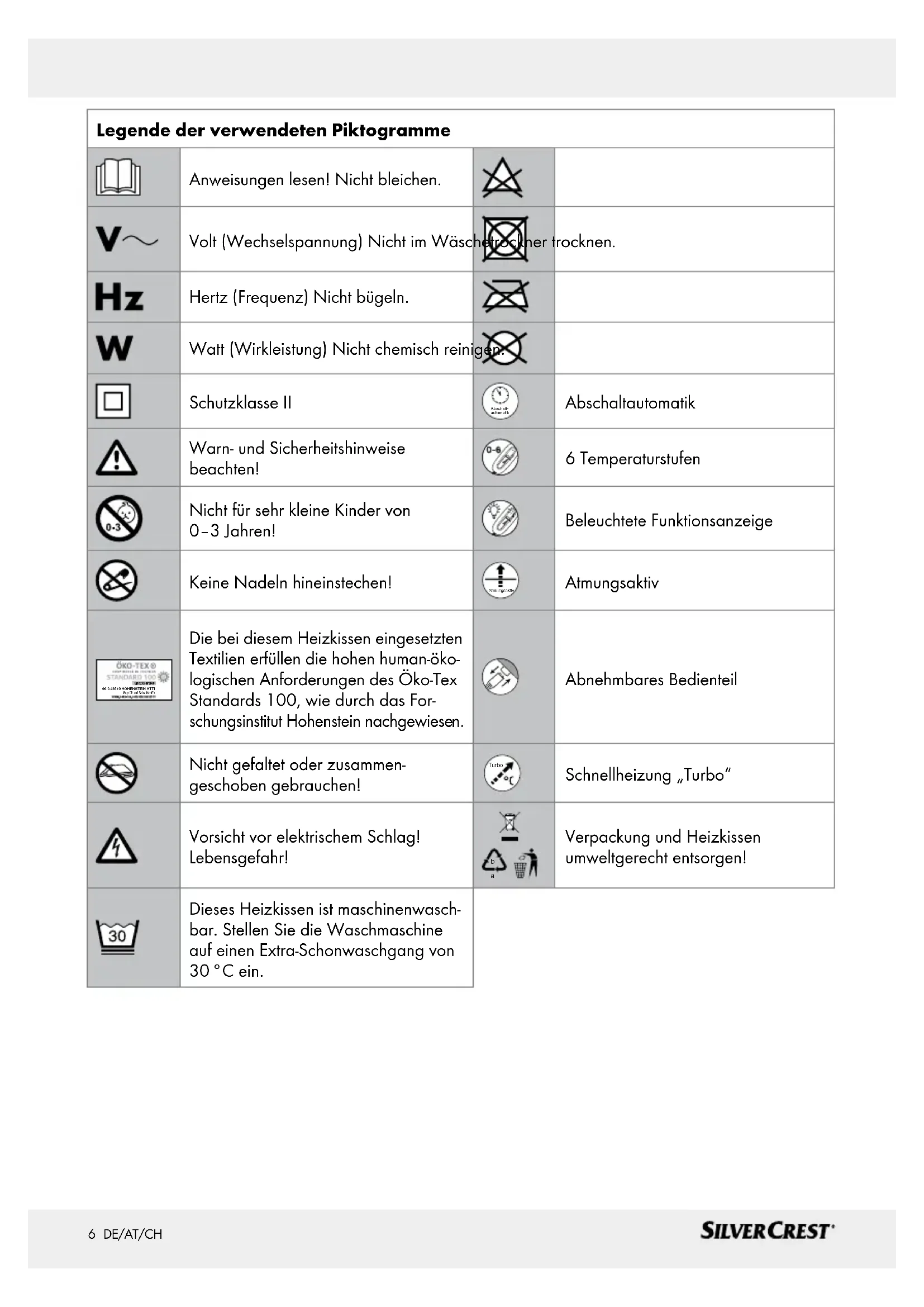 1 25 DE/AT/CH Inhaltsverzeichnis Legende der verwendeten Piktogramme ........................................................... Seite 6 Einleitung ......................................................................................................................................... Seite 7 Bestimmungsgemäßer Gebrauch .......................................................................................................Seite 7 Teilebeschreibung ...............................................................................................................................Seite 7 Lieferumfang ........................................................................................................................................ Seite 7 Technische Daten ................................................................................................................................Seite 7 Wichtige Sicherheitshinweise ........................................................................................Seite 8 Sicherheitssystem .....................................................................................................................Seite 10 Besondere Eigenschaften ..................................................................................................Seite 10 Inbetriebnahme ......................................................................................................................... Seite 10 Ein- / ausschalten / Temperatur wählen .............................................................................................Seite 11 Temperaturstufen ................................................................................................................................. Seite 11 Abschaltautomatik ...............................................................................................................................Seite 11 Reinigung und Pflege ............................................................................................................Seite 11 Lagerung .........................................................................................................................................Seite 12 Entsorgung .....................................................................................................................................Seite 12 Garantie / Service .....................................................................................................................Seite 13 Konformitätserklärung .......................................................................................................Seite 136 DE/AT/CH Einleitung Legende der verwendeten Piktogramme Anweisungen lesen! Nicht bleichen. Volt (Wechselspannung) Nicht im Wäschetrockner trocknen. Hertz (Frequenz) Nicht bügeln. Watt (Wirkleistung) Nicht chemisch reinigen. Schutzklasse II Abschalt-automatik Abschaltautomatik Warn- und Sicherheitshinweise beachten! 6 Temperaturstufen Nicht für sehr kleine Kinder von 0–3 Jahren! Beleuchtete Funktionsanzeige Keine Nadeln hineinstechen! Atmungsaktiv Atmungsaktiv