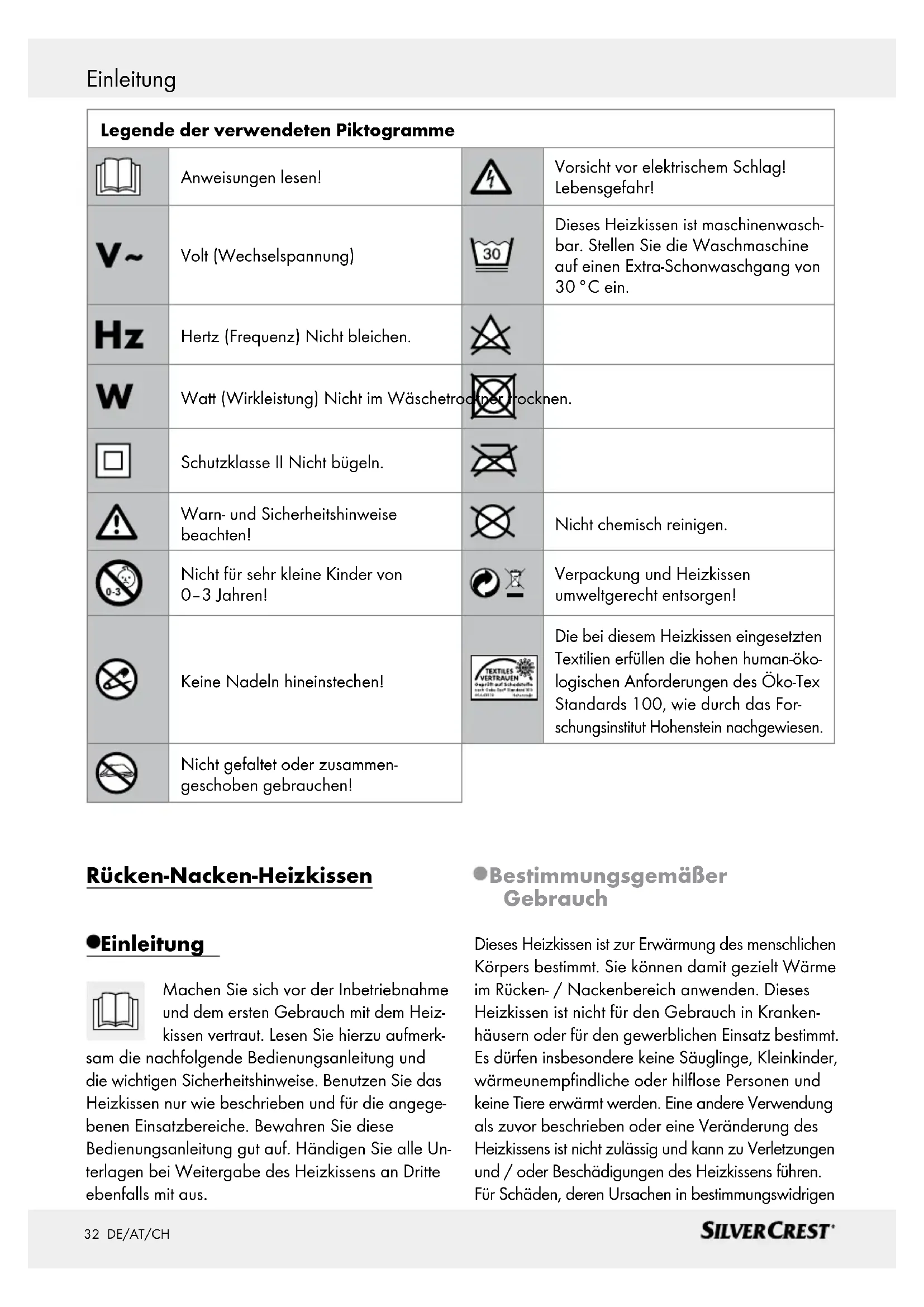 (ma. – fr.: 8–18 klok) service-nl@mgg-elektro.de 0800 70 611 (ma. – fr.: 8–18 klok) service-be@mgg-elektro.de Als wij u vragen, het defecte warmtekussen op te sturen, kunt u het product naar het volgend adres opsturen: NU Service GmbH Lessingstraße 10 b 89231 Neu-Ulm Duitsland IAN 275409 Verklaring van conformiteit Het warmtekussen voldoet aan de eisen die gelden voor Europese en nationale richtlijnen. Dit wordt bevestigd door het CE-keurmerk. Desbetreffende verklaringen liggen ter inzage bij de fabrikant. Bewaren / Verwijdering / Garantie / Service / Verklaring van conformiteit Inhaltsverzeichnis31 DE/AT/CH Bewaren / Verwijdering / Garantie / Service / Verklaring van conformiteit Inhaltsverzeichnis Legende der verwendeten Piktogramme ........................................................... Seite 32 Einleitung ......................................................................................................................................... Seite 32 Bestimmungsgemäßer Gebrauch .......................................................................................................Seite 32 Teilebeschreibung ...............................................................................................................................Seite 33 Lieferumfang ........................................................................................................................................ Seite 33 Technische Daten ................................................................................................................................Seite 33 Wichtige Sicherheitshinweise ........................................................................................Seite 33 Sicherheits-System ...................................................................................................................Seite 35 Inbetriebnahme ......................................................................................................................... Seite 36 Ein- / ausschalten / Temperatur wählen .............................................................................................Seite 36 Temperaturstufen ................................................................................................................................. Seite 36 Abschaltautomatik ...............................................................................................................................Seite 36 Reinigung und Pflege ............................................................................................................Seite 37 Lagerung .........................................................................................................................................Seite 37 Entsorgung .....................................................................................................................................Seite 38 Garantie / Service .....................................................................................................................Seite 38 Konformitätserklärung .......................................................................................................Seite 3832 DE/AT/CH Einleitung / Wichtige SicherheitshinweiseEinleitung Rücken-Nacken-Heizkissen Einleitung Machen Sie sich vor der Inbetriebnahme und dem ersten Gebrauch mit dem Heiz- kissen vertraut. Lesen Sie hierzu aufmerk- sam die nachfolgende Bedienungsanleitung und die wichtigen Sicherheitshinweise. Benutzen Sie das Heizkissen nur wie beschrieben und für die angege- benen Einsatzbereiche. Bewahren Sie diese Bedienungsanleitung gut auf. Händigen Sie alle Un- terlagen bei Weitergabe des Heizkissens an Dritte ebenfalls mit aus. Bestimmungsgemäßer Gebrauch Dieses Heizkissen ist zur Erwärmung des menschlichen Körpers bestimmt. Sie können damit gezielt Wärme im Rücken- / Nackenbereich anwenden. Dieses Heizkissen ist nicht für den Gebrauch in Kranken- häusern oder für den gewerblichen Einsatz bestimmt. Es dürfen insbesondere keine Säuglinge, Kleinkinder, wärmeunempfindliche oder hilflose Personen und keine Tiere erwärmt werden. Eine andere Verwendung als zuvor beschrieben oder eine Veränderung des Heizkissens ist nicht zulässig und kann zu Verletzungen und / oder Beschädigungen des Heizkissens führen. Für Schäden, deren Ursachen in bestimmungswidrigen Legende der verwendeten Piktogramme Anweisungen lesen! Vorsicht vor elektrischem Schlag! Lebensgefahr! Volt (Wechselspannung) Dieses Heizkissen ist maschinenwasch- bar. Stellen Sie die Waschmaschine auf einen Extra-Schonwaschgang von 30 °C ein. Hertz (Frequenz) Nicht bleichen. Watt (Wirkleistung) Nicht im Wäschetrockner trocknen. Schutzklasse II Nicht bügeln. Warn- und Sicherheitshinweise beachten! Nicht chemisch reinigen. Nicht für sehr kleine Kinder von 0–3 Jahren! Verpackung und Heizkissen umweltgerecht entsorgen! Keine Nadeln hineinstechen! Die bei diesem Heizkissen eingesetzt