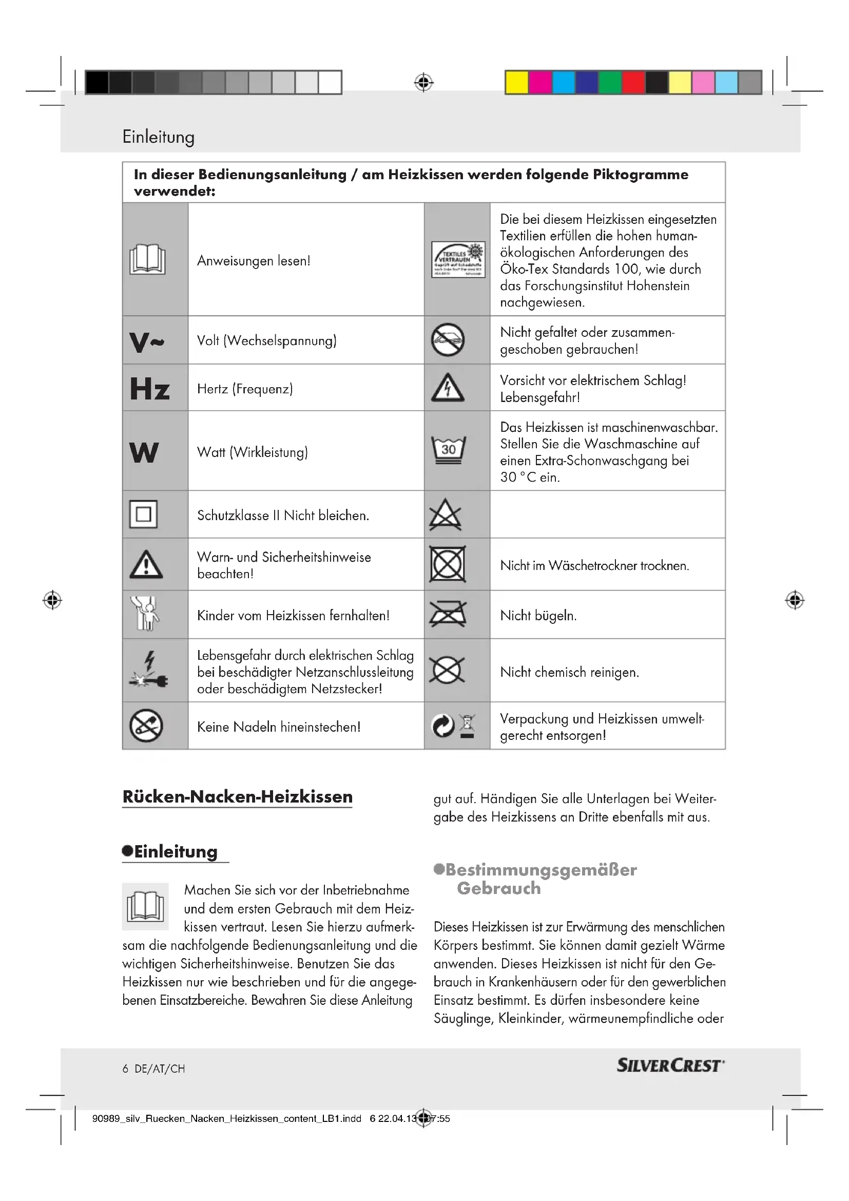 90989_silv_Ruecken_Nacken_Heizkissen_cover_LB1.indd 4 22.04.13 07:5390989_silv_Ruecken_Nacken_Heizkissen_cover_LB1.indd 5 22.04.13 07:535 DE/AT/CH Inhaltsverzeichnis Legende der verwendeten Piktogramme ........................................................... Seite 6 Einleitung ......................................................................................................................................... Seite 6 Bestimmungsgemäßer Gebrauch .......................................................................................................Seite 6 Teilebeschreibung ...............................................................................................................................Seite 7 Lieferumfang ........................................................................................................................................ Seite 7 Technische Daten ................................................................................................................................Seite 7 Wichtige Sicherheitshinweise ........................................................................................Seite 7 Sicherheits-System ...................................................................................................................Seite 9 Inbetriebnahme ......................................................................................................................... Seite 9 Ein- / ausschalten / Temperatur wählen .............................................................................................Seite 9 Temperaturstufen ................................................................................................................................. Seite 10 Abschaltautomatik ...............................................................................................................................Seite 10 Reinigung und Pflege ............................................................................................................Seite 10 Lagerung .........................................................................................................................................Seite 11 Entsorgung .....................................................................................................................................Seite 11 Garantie / Service .....................................................................................................................Seite 11 Konformitätserklärung .......................................................................................................Seite 12 90989_silv_Ruecken_Nacken_Heizkissen_content_LB1.indd 5 22.04.13 07:556 DE/AT/CH Einleitung Rücken-Nacken-Heizkissen Einleitung Machen Sie sich vor der Inbetriebnahme und dem ersten Gebrauch mit dem Heiz- kissen vertraut. Lesen Sie hierzu aufmerk- sam die nachfolgende Bedienungsanleitung und die wichtigen Sicherheitshinweise. Benutzen Sie das Heizkissen nur wie beschrieben und für die angege- benen Einsatzbereiche. Bewahren Sie diese Anleitung gut auf. Händigen Sie alle Unterlagen bei Weiter- gabe des Heizkissens an Dritte ebenfalls mit aus. Bestimmungsgemäßer Gebrauch Dieses Heizkissen ist zur Erwärmung des menschlichen Körpers bestimmt. Sie können damit gezielt Wärme anwenden. Dieses Heizkissen ist nicht für den Ge- brauch in Krankenhäusern oder für den gewerblichen Einsatz bestimmt. Es dürfen insbesondere keine Säuglinge, Kleinkinder, wärmeunempfindliche oder In dieser Bedienungsanleitung / am Heizkissen werden folgende Piktogramme verwendet: Anweisungen lesen! Die bei diesem Heizkissen eingesetzten Textilien erfüllen die hohen human- ökologischen Anforderungen des Öko-Tex Standards 100, wie durch das Forschungsinstitut Hohenstein nachgewiesen.