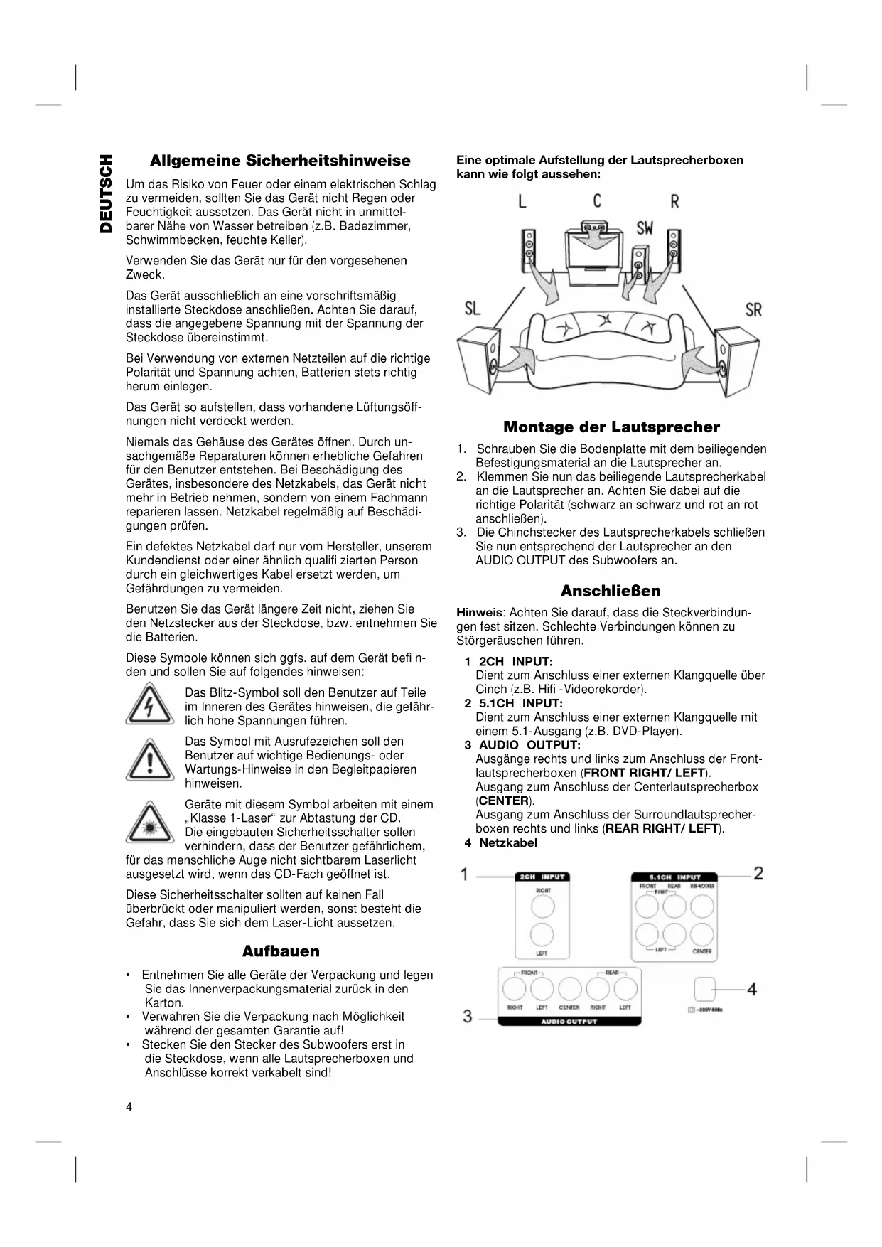 1 2CH INPUT RIGHT LEFT 5.1CH INPUT FRONT REAR 28W/OVER RIGHT LEFT CENTER 3 AUDIO OUTPUT 4 -230V 4MHzDie korrekte Verkabelung sieht wie folgt aus: