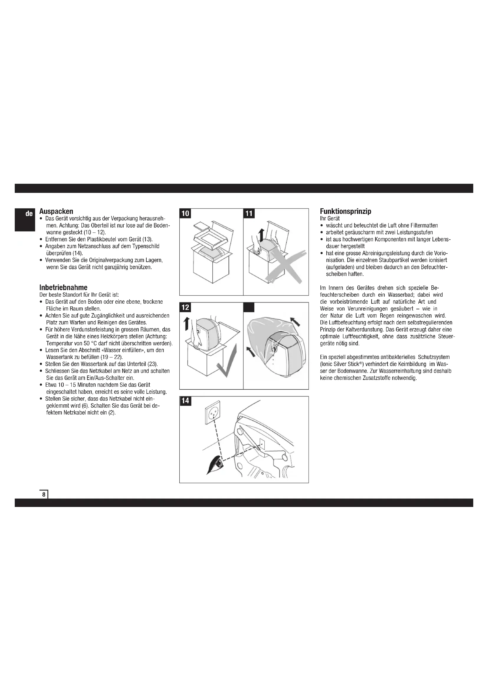 - hat eine grosse Abreinigungsleistung durch die Vorio- nisation. Die einzelnen Staubpartikel werden ionisiert (aufgeladen) und bleiben dadurch an den Befeuchter- scheiben haften. Im Innern des Gerätes drehen sich spezielle Be- feuchterscheiben durch ein Wasserbad; dabei wird die vorbeiströmende Luft auf natürliche Art und Weise von Verunreinigungen gesäubert – wie in der Natur die Luft vom Regen reingewaschen wird. Die Luftbefeuchtung erfolgt nach dem selbstregulierenden Prinzip der Kaltverdunstung. Das Gerät erzeugt daher eine optimale Luftfeuchtigkeit, ohne dass zusätzliche Steuer- geräte nötig sind. Ein speziell abgestimmtes antibakterielles Schutzsystem (Ionic Silver Stick