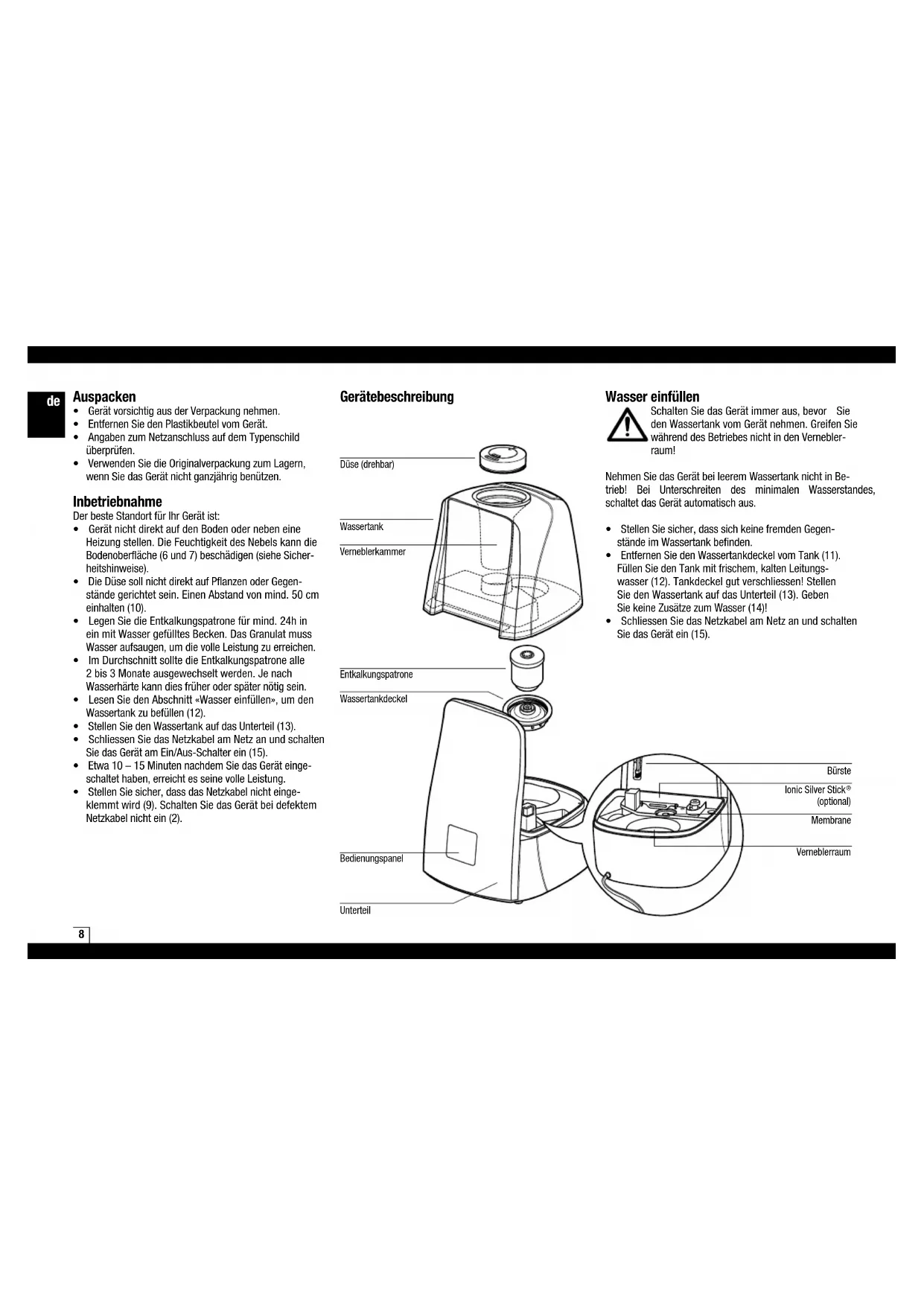 - FüllenSiekeineZusätzewieätherischeÖle, WasserreinhaltemittelundDuftstoffeein.DieseZusätze beschädigenIhrGerät!GerätediedurchZusätze beschädigtwerden,sindvonderGarantieausgenom- men.