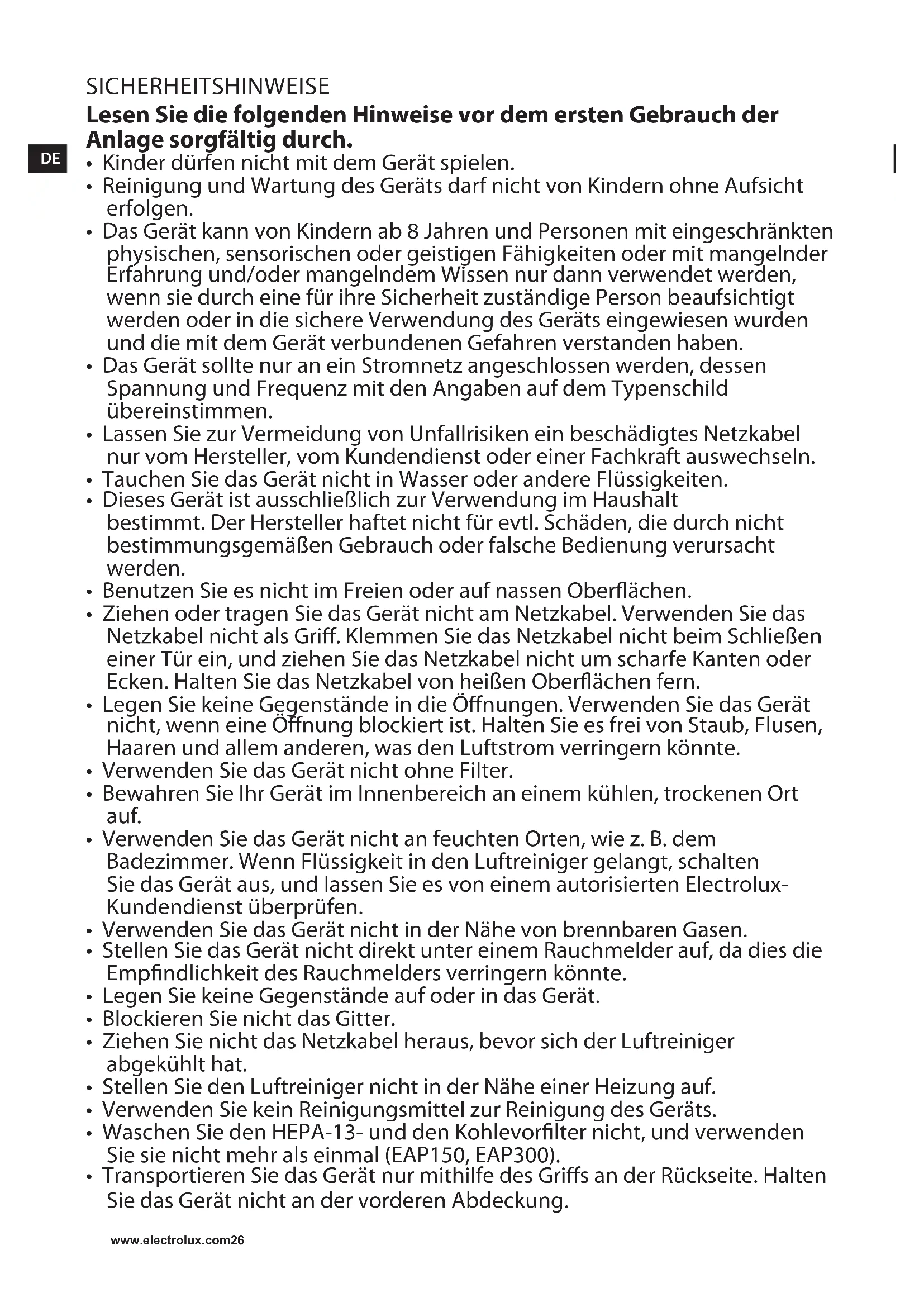 EAP150, EAP300, EAP450Auftreten Mögliche Ursache/AbhilfeKann ich den Filter waschen? Nein. Die Filter, mit denen das Gerät geliefert wird, fallen auseinander und gehen kaputt, wenn sie mit Wasser durchgespült werden. (Die Filter für das Modell EAP450 sind waschbar.)Kann ich den Filter absaugen? Nein. Durch das Staubsaugen wird nur der Staub wieder in die Luft abgegeben. Wenn Sie glauben, dass der Filter zu schmutzig ist, sollten Sie ihn ersetzen. (Der waschbare Vorlter für das Modell EAP450 kann mit einem Staubsauger oder einer weichen Bürste gereinigt werden.)Aus dem Gerät kommt ein unangenehmer Geruch, und ich habe es gerade erst ausgepackt.Das Gerät wurde fest mit Pappe und Kunststo umwickelt. Da das Gerät ein Gebläse hat, durch das die Luft hindurchströmt, können diese für neue Geräte typischen Gerüche entstehen. Je nach Empndlichkeit sollten sie nach einigen Tagen oder vielleicht einer Woche wieder abgeklungen sein, je nachdem, wie oft das Gerät benutzt wird.Wird eine größere Fläche gereinigt als angegeben?CADR-Klassikationen werden in einer kontrollierten Testumgebung ermittelt. Wenn die Umgebung sich ändert, kann dies Auswirkungen auf die Leistung haben. Wenn Sie über einen etwas größeren Raum verfügen als in der CADR-Klassizierung angegeben, wird das Gerät immer noch zur Verbesserung der Luft beitragen. Dies kann dann jedoch ein wenig länger dauern.www.electrolux.com30Wo soll ich das Gerät platzieren? Ermöglichen Sie seitlich und frontal um das Gerät herum eine ausreichende Luftzirkulation. Wenn Türen oder enge Flure vorhanden sind, kann der Luftstrom zum Luftreiniger beeinträchtigt werden, letztendlich aber nahe an der Anlage zirkulieren.Die Leuchte AIR QUALITY ist orange oder rot, aber die Luft erscheint sauber.Reinigen Sie den Sensor mit einem Staubsauger, da er möglicherweise blockiert oder verstopft ist.Manchmal kann ein komprimierter Luftstoß den Staub in dem Sensor lösen.Es ist immer noch ein wenig Staub in der Luft oder auf meinen Möbeln.Das Gerät nimmt den größten Teil an Staub und Partikeln auf. Durch das Önen von Türen und Fenstern sowie durch HVAC-Systeme usw. kann jedoch immer noch etwas Staub verbleiben, den Sie sehen können.Die Filter werden nicht in der Position gehalten.Die Filter sollen im Innern des Geräts bleiben. Sobald das Gerät eingeschaltet wird, erzeugt die Kraft der Luft, die durch das Gerät gezogenen wird, eine feste Abdichtung der Filter.Ich kann das Drehen des Gebläsemotors hören.Dies ist normal. Vor allem am Abend, wenn alle Umgebungsgeräusche ruhig sind, hören Sie, wie sich der Motor immer wieder dreht.Das Gerät entfernt die Gerüche nicht mehr eektiv oder scheint einen unangenehmen Geruch abzusondern.Stellen Sie sicher, dass der Sensor zur Messung der Luftqualität nicht blockiert oder verstopft ist.Bewegen Sie das Gerät näher an die störenden Gerüche heran.Ersetzen Sie die Filter, da sie möglicherweise ihre Kapazität zum Aufnehmen der Verschmutzungen erreicht haben. Möglicherweise müssen Sie die Filter häuger ersetzen.Überprüfen Sie, ob die Anzeige CHECK FILTER nach dem Austausch des HEPA-Filters weiterhin leuchtet.Drücken Sie die Taste RESET FILTER, indem Sie vorsichtig eine Büroklammer in das Loch RESET FILTER einführen. Halten Sie sie drei bis fünf Sekunden lang gedrückt, bis ein Piepton ertönt, um anzuzeigen, dass die Einheit zurückgesetzt wurde. ■ ■ ■ EAP300, EAP450Auftreten Mögliche Ursache/AbhilfeKann ich den Schlaf-Modus ausschalten? Nein. Sie können jedoch die Geschwindigkeit des Gebläses manuell nach Ihren Wünschen anpassen. Dann wird diese Geschwindigkeit beibehalten, bis Sie sie ändern. Das Gerät macht ein tickendes Geräusch. Dies wird durch die PlasmaWave™-Technologie verursacht. Es kann je nach Umgebung kommen und gehen. Aber so lange die PlasmaWave™-Anzeige leuchtet, arbeitet die Funktion. Die Fernbedienung funktioniert nicht. Stellen Sie sicher, dass die Batterie der Fernbedienung richtig eingesetzt ist. Ersetzen Sie eine verbrauchte Batterie.Stellen Sie sicher, dass die Fernbedienung hat eine klare Sichtachse zum Luftreiniger hat. ■ ■ ■ EAP450Auftreten Mögliche Ursache/AbhilfeDie Leuchte für die Luftqualität ist weiß, aber es ist immer noch Staub/Geruch in der Luft.Stellen Sie sicher, dass der Sensor nicht blockiert oder verstopft ist.Ersetzen Sie den Filter.Das Gerät scheint unangenehme Gerüche zu verursachen.Bewegen Sie das Gerät näher an die störenden Gerüche heran.Ersetzen Sie den Filter.Es ist immer noch ein wenig Staub in der Luft oder auf meinen Möbeln.Das Gerät nimmt den größten Teil an Staub und Partikeln auf. Durch das Önen von Türen und Fenstern sowie durch HVAC-Systeme usw. kann jedoch immer noch etwas Staub verbleiben, den Sie sehen können. Das Gerät läuft ständig auf Hochbetrieb. Reinigen Sie den Sensor mit einem Staubsauger, da er möglicherweise blockiert oder verstopft ist.Manchmal kann ein komprimierter Luftstoß den Staub in dem Sensor lösen.Überprüfen Sie, ob die Anzeige CHECK FILTER nach dem Austausch der Filterkassette weiterhin leuchtet.Drücken Sie die Taste RESET FILTER, indem Sie vorsichtig eine Büroklammer in das Loch RESET FILTER einführen. Halten Sie sie drei bis fünf Sekunden lang gedrückt, bis ein Piepton ertönt, um anzuzeigen, dass die Einheit zurückgesetzt wurde. ENTSORGUNG Recyceln Sie Materialien mit dem Symbol . Entsorgen Sie die Verpackung in den entsprechenden Recyclingbehältern. Recyceln Sie zum Umwelt- und Gesundheitsschutz elektrische und elektronische Geräte. Entsorgen Sie Geräte mit diesem Symbol nicht mit dem Hausmüll. Bringen Sie das Gerät zu Ihrer örtlichen Sammelstelle oder wenden Sie sich an Ihr Gemeindeamt.