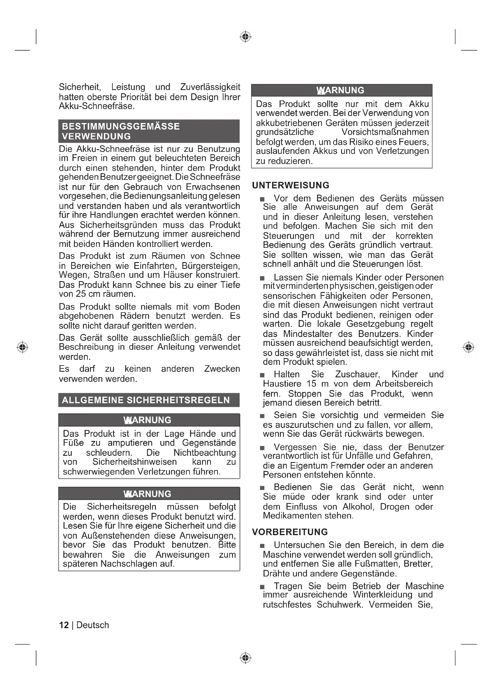 Die Akku-Schneefräse ist nur zu Benutzung im Freien in einem gut beleuchteten Bereich durch einen stehenden, hinter dem Produkt gehenden Benutzergeeignet. Die Schneefräse ist nur für den Gebrauch von Erwachsenen vorgesehen, die Bedienungsanleitung gelesen und verstanden haben und als verantwortlich für ihre Handlungen erachtet werden können. Aus Sicherheitsgründen muss das Produkt während der Bernutzung immer ausreichend mit beiden Händen kontrolliert werden.