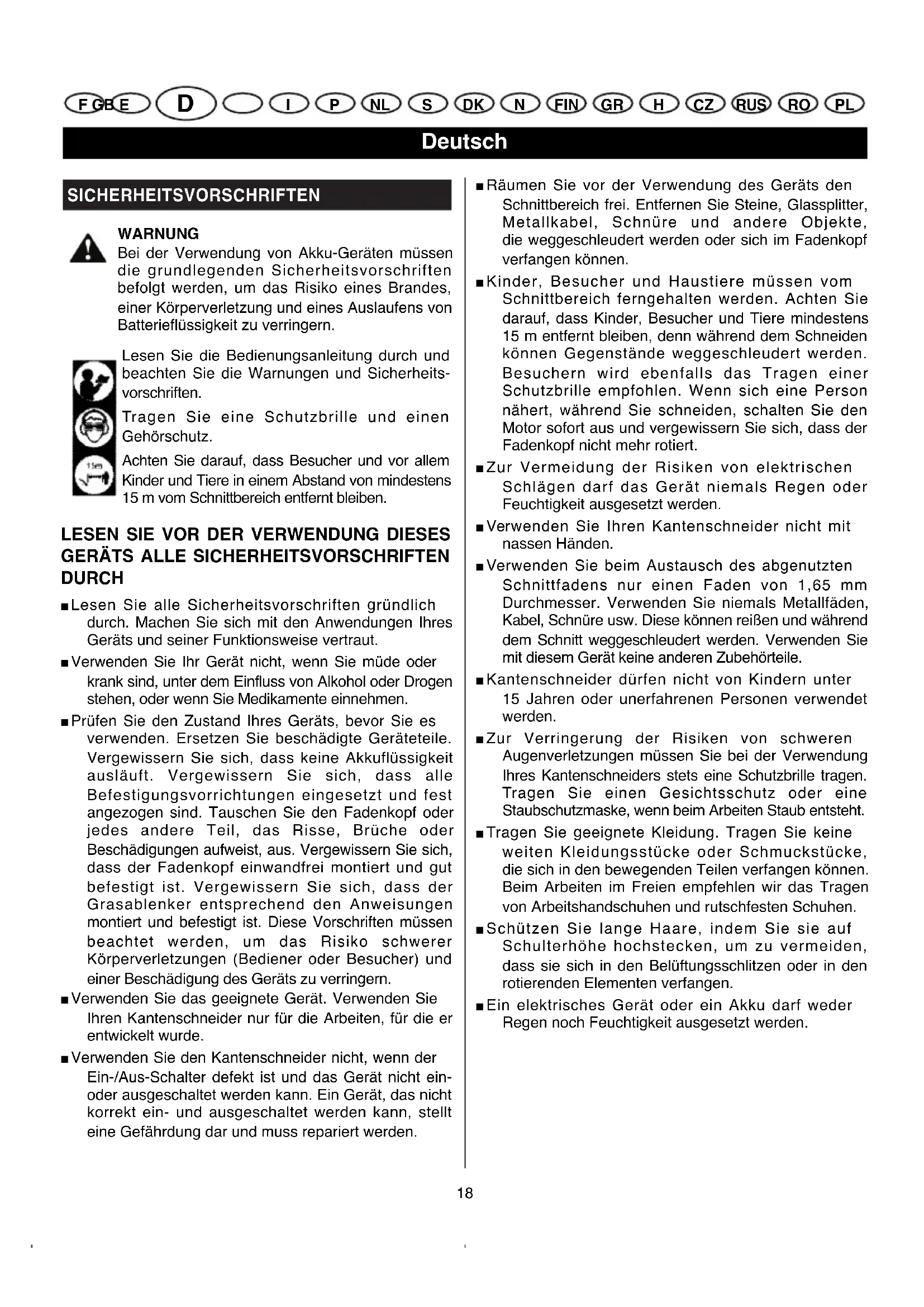 F D E English I P NL S DK N FIN GR H CZ RUS RO PL CLT-1423P / 1823 P manual 24/11/04 11:57 Page 17SICHERHEITSVORSCHRIFTEN WARNUNG Bei der Verwendung von Akku-Geräten müssen die grundlegenden Sicherheitsvorschriften befolgt werden, um das Risiko eines Brandes, einer Körperverletzung und eines Auslaufens von Batterieflüssigkeit zu verringern. Lesen Sie die Bedienungsanleitung durch und beachten Sie die Warnungen und Sicherheits- vorschriften. Tragen Sie eine Schutzbrille und einen Gehörschutz. Achten Sie darauf, dass Besucher und vor allem Kinder und Tiere in einem Abstand von mindestens 15 m vom Schnittbereich entfernt bleiben.