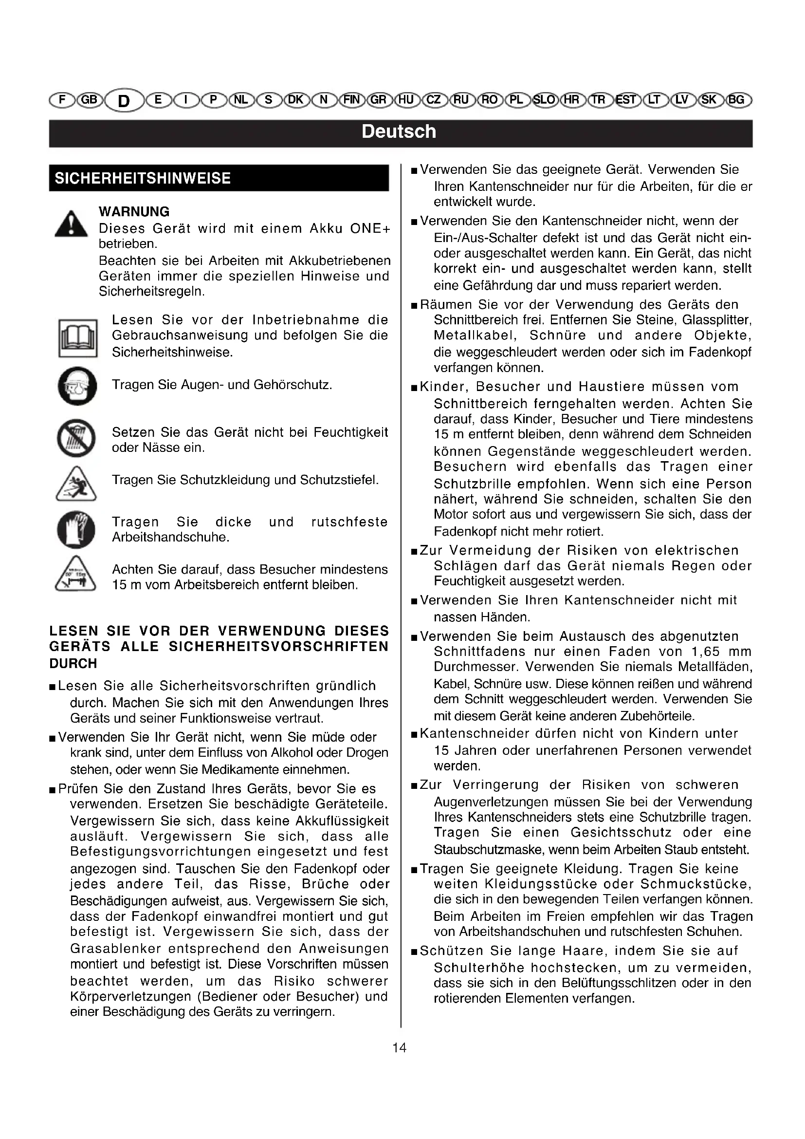 ■Wenn der Kantenschneider auf ein Hindernis stöhlt oder wenn sich ein Objekt im Fadenkopf verfüngt, schalten Sie das Gerät sofort aus, entfern den Akku und prufen, ob kein Teil beschädigt wurde. Verwenden Sie Ihr Gerät erst wieder, nach dem Sie die erforderlichen Reparaturen durchgehurt haben. Verwenden Sie Ihr Gerät nicht, wenn Teile nicht einwandfrei montiert oder beschädigt sind.