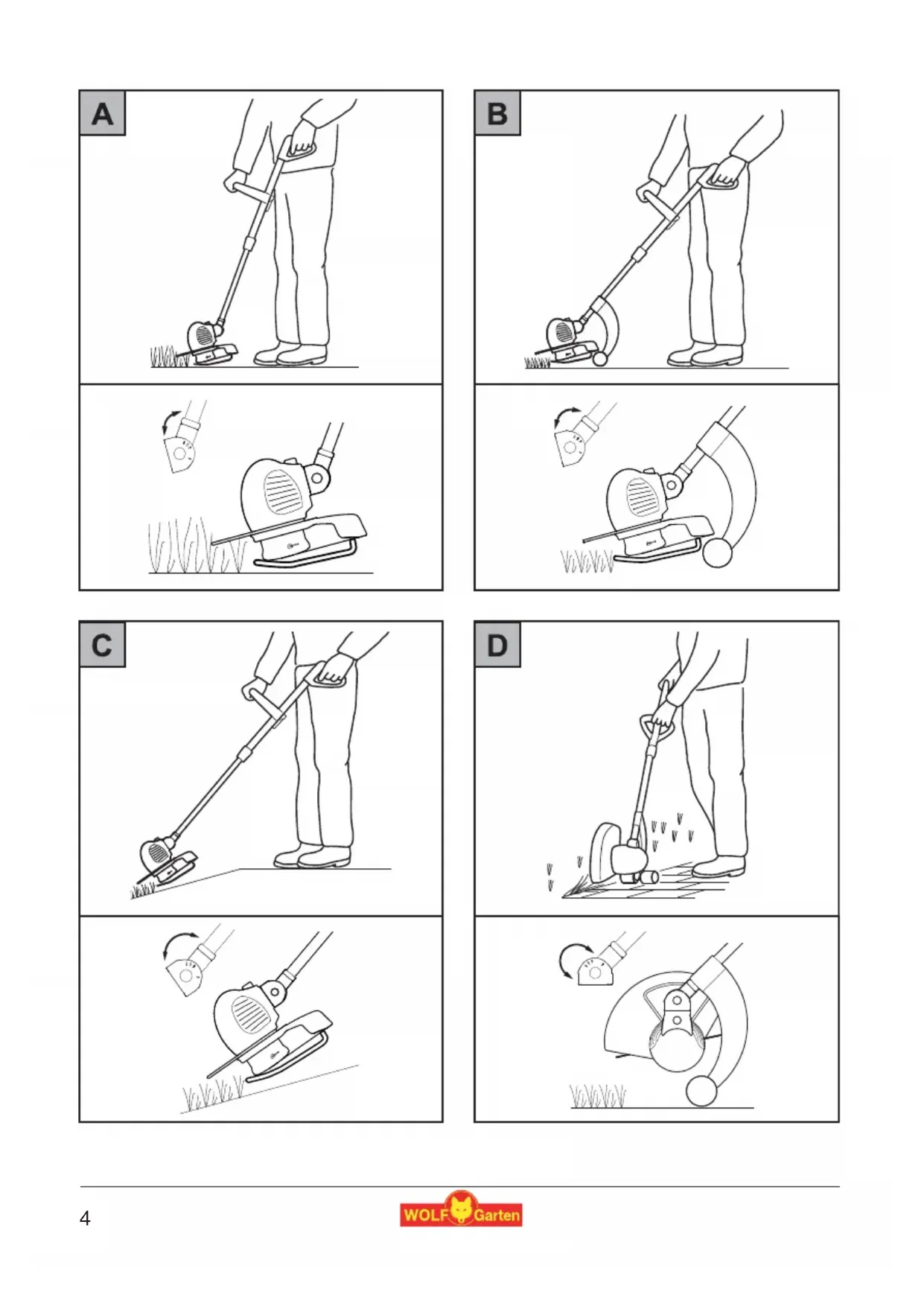 Der Rasentrimmer verfügt über einen 4-fach verstillbaren Arbeitswinkel. Dadurch konnen Sie problematische und schwer zugängliche Stellen im Garten bequem erreichen. Um die optimale Arbeitsposition einzustellen, sollen den Sieitte die folgenden Hinweise beachten.