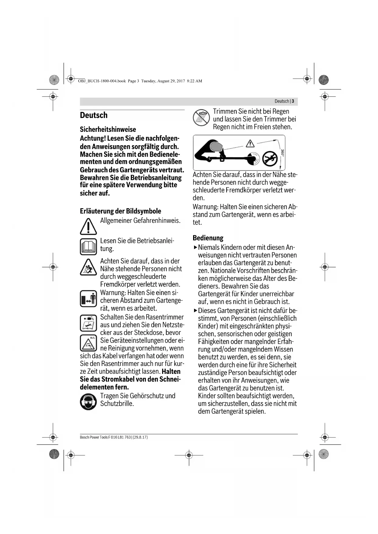 . . . . . . . . . . . . . . . . . . . . . . . . . . . . . . . . . . . . . . . . . . . . . . . . . I OBJ_BUCH-1800-004.book Page 2 Tuesday, August 29, 2017 8:22 AMDeutsch | 3 Bosch Power Tools F 016 L81 763 | (29.8.17) Deutsch Sicherheitshinweise Achtung! Lesen Sie die nachfolgen- den Anweisungen sorgfältig durch. Machen Sie sich mit den Bedienele- menten und dem ordnungsgemäßen Gebrauch des Gartengeräts vertraut. Bewahren Sie die Betriebsanleitung für eine spätere Verwendung bitte sicher auf. Erläuterung der Bildsymbole Allgemeiner Gefahrenhinweis. Lesen Sie die Betriebsanlei- tung. Achten Sie darauf, dass in der Nähe stehende Personen nicht durch weggeschleuderte Fremdkörper verletzt werden. Warnung: Halten Sie einen si- cheren Abstand zum Gartenge- rät, wenn es arbeitet. Schalten Sie den Rasentrimmer aus und ziehen Sie den Netzste- cker aus der Steckdose, bevor Sie Geräteeinstellungen oder ei- ne Reinigung vornehmen, wenn sich das Kabel verfangen hat oder wenn Sie den Rasentrimmer auch nur für kur- ze Zeit unbeaufsichtigt lassen. Halten Sie das Stromkabel von den Schnei- delementen fern. Tragen Sie Gehörschutz und Schutzbrille. Trimmen Sie nicht bei Regen und lassen Sie den Trimmer bei Regen nicht im Freien stehen. Achten Sie darauf, dass in der Nähe ste- hende Personen nicht durch wegge- schleuderte Fremdkörper verletzt wer- den. Warnung: Halten Sie einen sicheren Ab- stand zum Gartengerät, wenn es arbei- tet. Bedienung