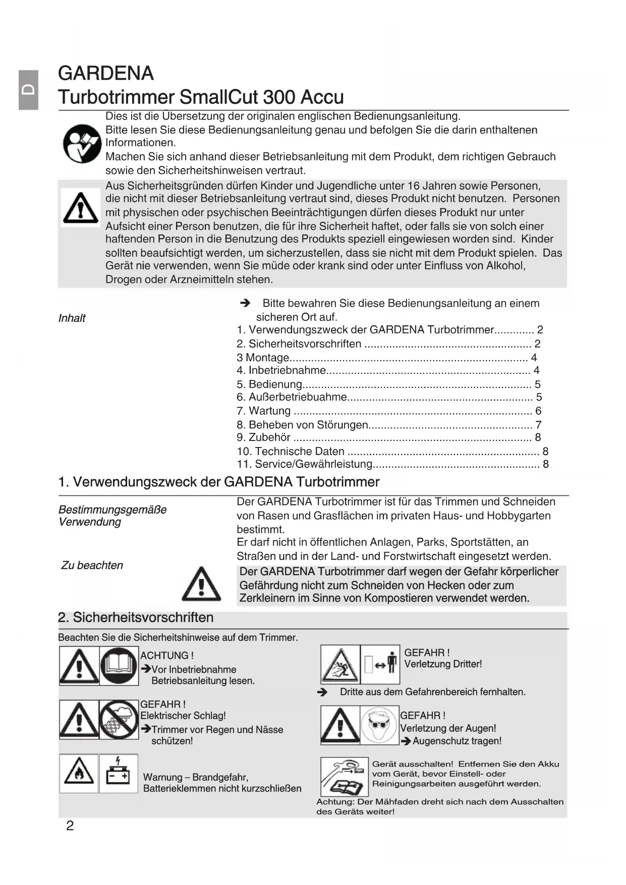 GARDENA Turbotrimmer SmallCut 300 Accu Dies ist die Übersetzung der originalen englischen Bedienungsanleitung. Bitte lesen Sie diese Bedienungsanleitung genau und befolgen Sie die darin enthaltenen Informationen. Machen Sie sich anhand dieser Betriebsanleitung mit dem Produkt, dem richtigen Gebrauch sowie den Sicherheitshinweisen vertraut. Aus Sicherheitsgründen dürfen Kinder und Jugendliche unter 16 Jahren sowie Personen, die nicht mit dieser Betriebsanleitung vertraut sind, dieses Produkt nicht benutzen. Personen mit physischen oder psychischen Beeinträchtigungen dürfen dieses Produkt nur unter Aufsicht einer Person benutzen, die für ihre Sicherheit haftet, oder falls sie von solch einer haftenden Person in die Benutzung des Produkts speziell eingewiesen worden sind. Kinder sollten beaufsichtigt werden, um sicherzustellen, dass sie nicht mit dem Produkt spielen. Das Gerät nie verwenden, wenn Sie müde oder krank sind oder unter Einfluss von Alkohol, Drogen oder Arzneimitteln stehen. Bitte bewahren Sie diese Bedienungsanleitung an einem sicheren Ort auf.