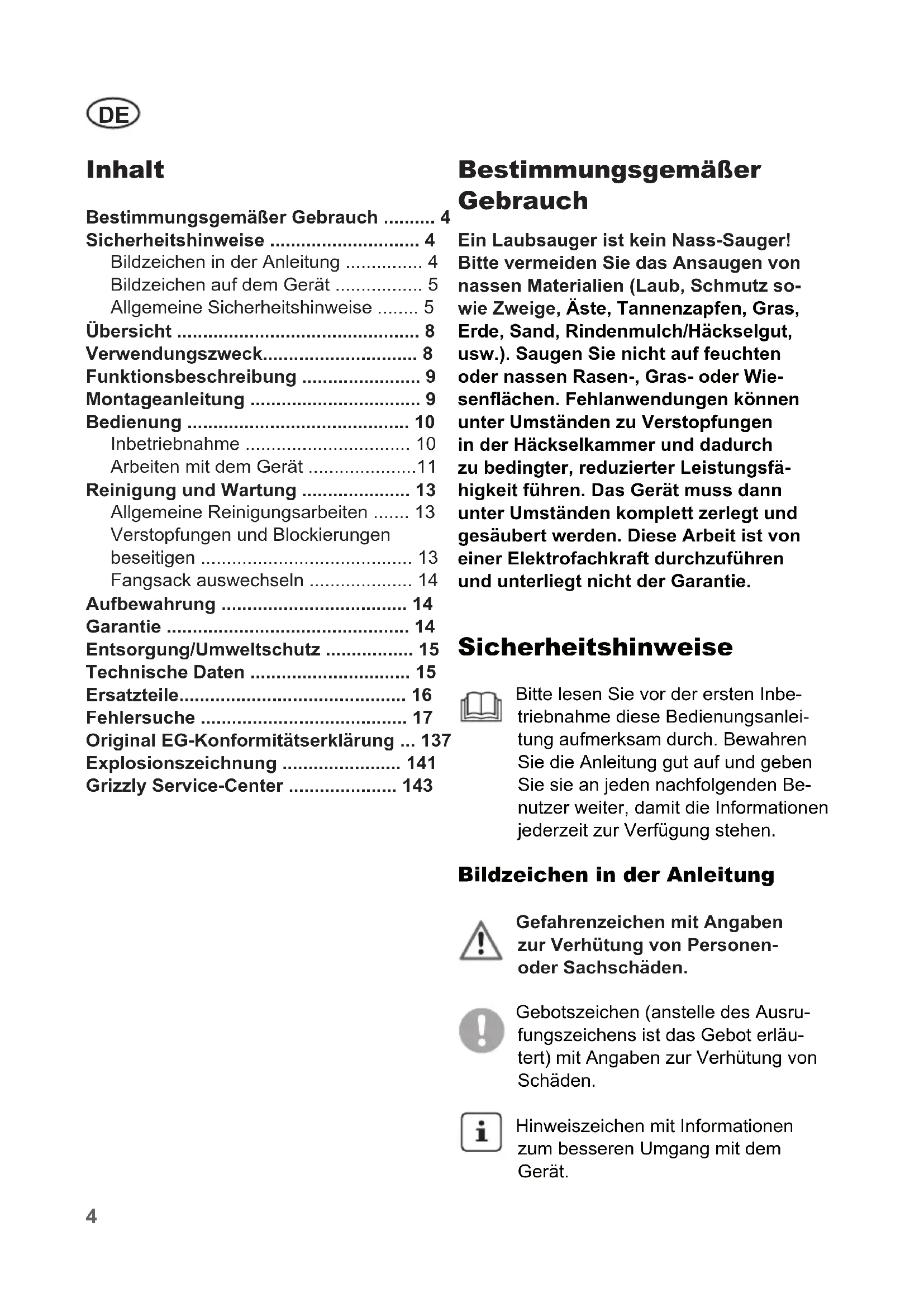 Bitte vermeiden Sie das Ansaugen von nassen Materialien (Laub, Schmutz sowie Zweige, Åste, Tannenzapfen, Gras, Erde, Sand, Rindemulch/Häckselgut, usw.). Saugen Sie nicht auf feuchten oder nassen Rasen-, Gras- oder Wiesenflächen. Fehlanwendungen können unter Umständen zu Verstopfungen in der Häckselkammer und dadurch zu bedingter, reduzierter Leistungsfähigkeit führen. Das Gerät muss dann unter Umständen komplett zerlegt und gesaubert werden. Diese Arbeit ist von einer Elektrofachkraft durchzuführen und unterliegt nicht der Garantie.