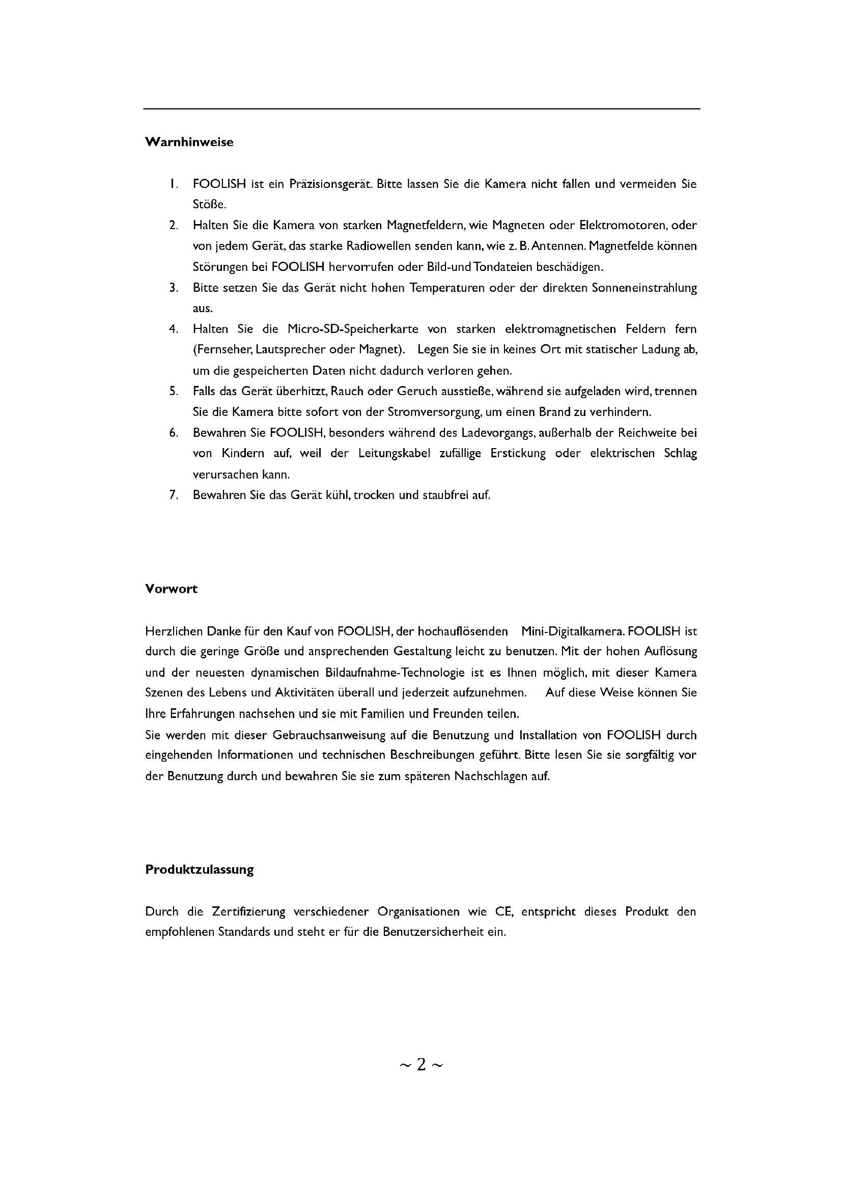 Vorwort Herzlichen Danke für den Kauf von FOOLISH, der hochauflösenden Mini-Digitalkamera. FOOLISH ist durch die geringe Größe und ansprechenden Gestaltung leicht zu benutzen. Mit der hohen Auflösung und der neuesten dynamischen Bildaufnahme-Technologie ist es Ihnen möglich, mit dieser Kamera Szenen des Lebens und Aktivitäten überall und jederzeit aufzunehmen. Auf diese Weise können Sie Ihre Erfahrungen nachsehen und sie mit Familien und Freunden teilen. Sie werden mit dieser Gebrauchsanweisung auf die Benutzung und Installation von FOOLISH durch eingehenden Informationen und technischen Beschreibungen geführt. Bitte lesen Sie sie sorgfältig vor der Benutzung durch und bewahren Sie sie zum späteren Nachschlagen auf.