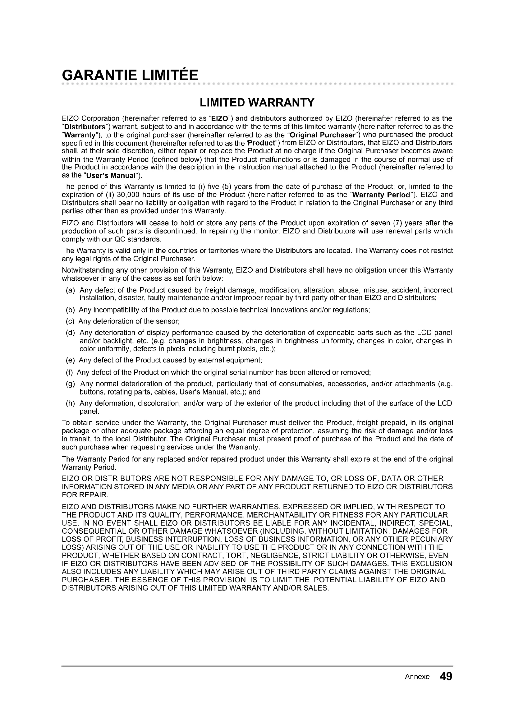 Garantie »), garantissent à l’acheteur initial (ci-après dénommé « Acheteur initial ») du produit spécifié dans la présente (ci-après dénommé « Produit ») acheté auprès d’EIZO ou de Distributeurs agréés EIZO, que EIZO et ses Distributeurs auront pour option de réparer ou remplacer gratuitement le Produit si l’Acheteur initial constate, pendant la Période de garantie (dé nie ci-dessous), qu’il y a un dysfonctionnement ou que le Produit a subi un dommage dans le cadre d’une utilisation normale du Produit conformément à la description du mode d’emploi qui accompagne le Produit (ci-après dénommé « Manuel d’utilisation »). La période de cette Garantie est limitée à (i) cinq (5) ans à partir de la date d’achat du Produit ; ou, limitée jusqu’à l’expiration de (ii) 30 000 heures d’utilisation du Produit (ci-après dénommée « Période de Garantie »). EIZO et ses Distributeurs déclinent toute responsabilité ou obligation concernant ce Produit face à l’Acheteur initial ou à toute autre personne à l’exception de celles stipulées dans la présente Garantie. EIZO et ses Distributeurs cesseront de tenir ou conserver en stock toute pièce de ce Produit après l’expiration de la période de sept (7) ans suivant l’arrêt de la production de telles pièces. Pour réparer le moniteur, EIZO et ses distributeurs utiliseront des pièces de rechange conformes à nos normes de contrôle qualité. La Garantie est valable uniquement dans les pays ou les territoires où se trouvent les Distributeurs. La Garantie ne limite aucun des droits reconnus par la loi à l’Acheteur initial. Nonobstant toute autre clause de cette Garantie, EIZO et ses Distributeurs n’auront d’obligation dans le cadre de cette Garantie pour aucun des cas énumérés ci-dessous : (a) Tout défaut du Produit résultant de dommages occasionnés lors du transport, d’une modi cation, d’une altération, d’un abus, d’une mauvaise utilisation, d’un accident, d’une installation incorrecte, d’un désastre, d’un entretien et/ ou d’une réparation incorrects effectués par une personne autre que EIZO ou ses Distributeurs ; (b) Toute incompatibilité du Produit résultant d’améliorations techniques et/ou réglementations possibles ; (c) Toute détérioration du capteur ; (d) Toute détérioration des performances d’affichage causée par la détérioration des éléments consommables tels que le panneau LCD et/ou le rétroéclairage, etc. (par exemple des changements de luminosité, des changements de l’uniformité de la luminosité, des modi cations de couleur, des changements de l’uniformité des couleurs, des défectuosités de pixels y compris des pixels brûlés, etc.); (e) Tout défaut du Produit causé par un appareil externe ; (f) Tout défaut d’un Produit sur lequel le numéro de série original a été altéré ou supprimé ; (g) Toute détérioration normale du Produit, particulièrement celle des consommables, des accessoires et/ou des pièces reliées au Produit (touches, éléments pivotants, câbles, Manuel d’utilisation etc.), et (h) Toute déformation, décoloration, et/ou gondolage de l’extérieur du Produit, y compris celle de la surface du panneau LCD. Pour béné cier d’un service dans le cadre de cette Garantie, l’Acheteur initial doit renvoyer le Produit port payé, dans son emballage d’origine ou tout autre emballage approprié offrant un degré de protection équivalent, au Distributeur local, et assumera la responsabilité des dommages et/ou perte possibles lors du transport. L’Acheteur initial doit présenter une preuve d’achat du Produit comprenant sa date d’achat pour béné cier de ce service dans le cadre de la Garantie. La Période de garantie pour tout Produit remplacé et/ou réparé dans le cadre de cette Garantie expirera à la n de la Période de garantie initiale. EIZO OU SES DISTRIBUTEURS NE SAURAIENT ÊTRE TENUS RESPONSABLES DES DOMMAGES OU PERTES DE DONNÉES OU D’AUTRES INFORMATIONS STOCKÉES DANS UN MÉDIA QUELCONQUE OU UNE AUTRE PARTIE DU PRODUIT RENVOYÉ À EIZO OU AUX DISTRIBUTEURS POUR RÉPARATION. AUCUNE AUTRE GARANTIE, EXPLICITE OU TACITE, N’EST OFFERTE PAR EIZO ET SES DISTRIBUTEURS CONCERNANT LE PRODUIT ET SES QUALITÉS, PERFORMANCES, QUALITÉ MARCHANDE OU ADAPTATION À UN USAGE PARTICULIER. EN AUCUN CAS, EIZO OU SES DISTRIBUTEURS NE SERONT RESPONSABLES DES DOMMAGES FORTUITS, INDIRECTS, SPÉCIAUX, INDUITS, OU DE TOUT AUTRE DOMMAGE QUEL QU’IL SOIT (Y COMPRIS, SANS LIMITATION, LES DOMMAGES RÉSULTANT D’UNE PERTE DE PROFIT, D’UNE INTERRUPTION D’ACTIVITÉS, D’UNE PERTE DE DONNÉES COMMERCIALES, OU DE TOUT AUTRE MANQUE À GAGNER) RÉSULTANT DE L’UTILISATION OU DE L’INCAPACITÉ D’UTILISER LE PRODUIT OU AYANT UN RAPPORT QUELCONQUE AVEC LE PRODUIT, QUE CE SOIT SUR LA BASE D’UN CONTRAT, D’UN TORT, D’UNE NÉGLIGENCE, D’UNE RESPONSABILITÉ STRICTE OU AUTRE, MÊME SI EIZO OU SES DISTRIBUTEURS ONT ÉTÉ AVERTIS DE LA POSSIBILITÉ DE TELS DOMMAGES. CETTE LIMITATION INCLUT AUSSI TOUTE RESPONSABILITÉ QUI POURRAIT ÊTRE SOULEVÉE LORS DES RÉCLAMATIONS D’UN TIERS CONTRE L’ACHETEUR INITIAL. L’ESSENCE DE CETTE CLAUSE EST DE LIMITER LA RESPONSABILITÉ POTENTIELLE DE EIZO ET DE SES DISTRIBUTEURS RÉSULTANT DE CETTE GARANTIE LIMITÉE ET/OU DES VENTES. BEGRENZTE GARANTIE EIZO Corporation (im Weiteren als „EIZO“ bezeichnet) und die Vertragsimporteure von EIZO (im Weiteren als „Vertrieb(e)“ bezeichnet) garantieren dem ursprünglichen Käufer (im Weiteren als „Erstkäufer“ bezeichnet), der das in diesem Dokument vorgegebene Produkt (im Weiteren als „Produkt“ bezeichnet) von EIZO oder einem Vertrieb erworben hat, gemäß den Bedingungen dieser beschränkten Garantie (im Weiteren als „Garantie“ bezeichnet), dass EIZO und der Vertrieb nach eigenem Ermessen das Produkt entweder kostenlos reparieren oder austauschen, falls der Erstkäufer innerhalb der Garantief