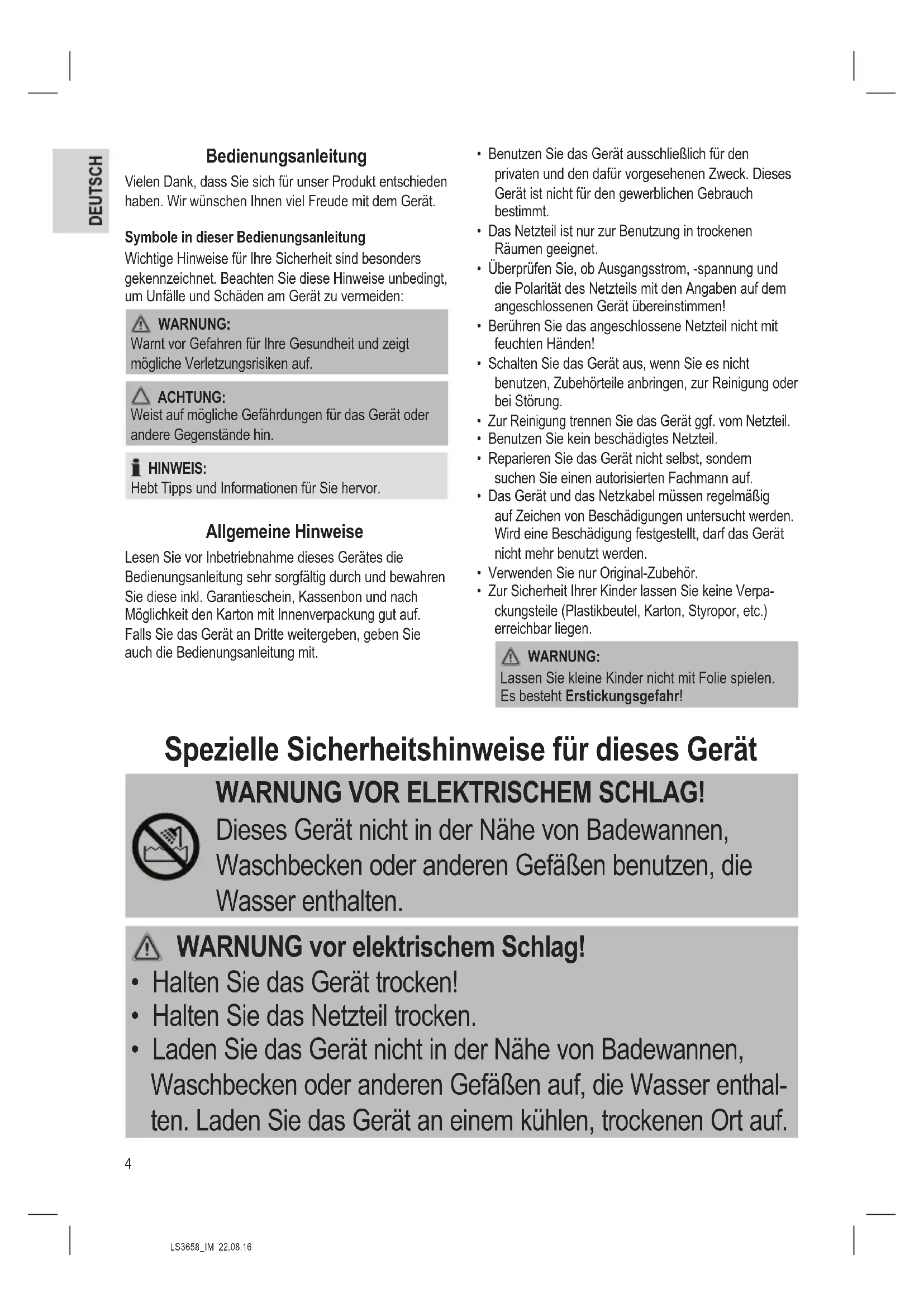 - Benutzen Sie das Gerät ausschließlich für den privaten und den darauf vorgesehenen Zweck. Diese Gerät ist nicht für den gewerblichen Gebrauch bestimmt.
