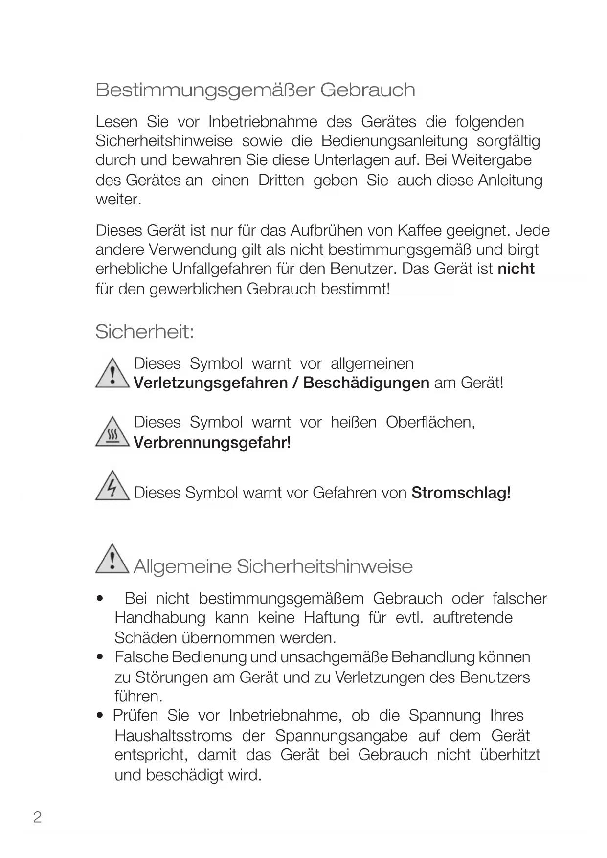 Bestimmungsgemäßer Gebrauch Lesen Sie vor Inbetriebnahme des Gerätes die folgenden Sicherheitshinweise sowie die Bedienungsanleitung sorgfältig durch und bewahren Sie diese Unterlagen auf. Bei Weitergabe des Gerätes an einen Dritten geben Sie auch diese Anleitung weiter. Dieses Gerät ist nur für das Aufbrühen von Kaffee geeignet. Jede andere Verwendung gilt als nicht bestimmungsgemäß und birgt erhebliche Unfallgefahren für den Benutzer. Das Gerät ist nicht für den gewerblichen Gebrauch bestimmt! Sicherheit: Dieses Symbol warnt vor allgemeinen Verletzungsgefahren / Beschädigungen am Gerät! Dieses Symbol warnt vor heißen Oberflächen, Verbrennungsgefahr! Dieses Symbol warnt vor Gefahren von Stromschlag! Allgemeine Sicherheitshinweise