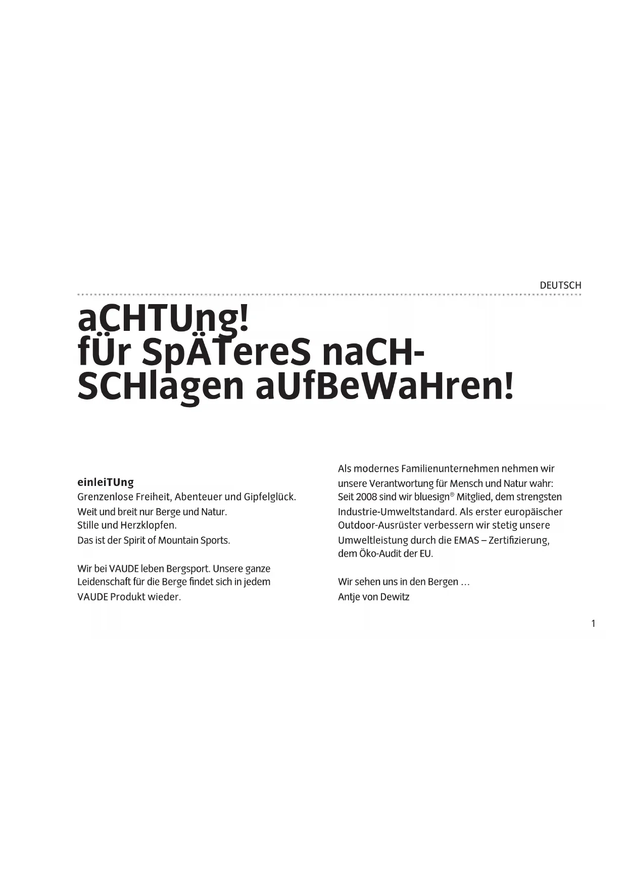 aCHTUng! fÜr SpÄTereS naCH- SCHlagen aUfBeWaHren! DEUTSCH einleiTUng Grenzenlose Freiheit, Abenteuer und Gipfelglück. Weit und breit nur Berge und Natur. Stille und Herzklopfen. Das ist der Spirit of Mountain Sports. Wir bei VAUDE leben Bergsport. Unsere ganze Leidenschaft für die Berge findet sich in jedem VAUDE Produkt wieder. Als modernes Familienunternehmen nehmen wir unsere Verantwortung für Mensch und Natur wahr: Seit 2008 sind wir bluesign® Mitglied, dem strengsten Industrie-Umweltstandard. Als erster europäischer Outdoor-Ausrüster verbessern wir stetig unsere Umweltleistung durch die EMAS – Zertifizierung, dem Öko-Audit der EU. Wir sehen uns in den Bergen … Antje von Dewitz2 DEUTSCH plaTZWaHl: