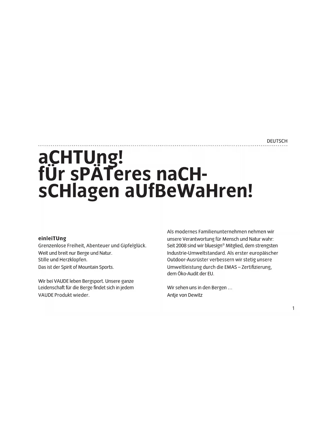 aCHTUng! fÜr sPÄTeres naCH- sCHlagen aUfBeWaHren! DEUTSCH einleiTUng Grenzenlose Freiheit, Abenteuer und Gipfelglück. Weit und breit nur Berge und Natur. Stille und Herzklopfen. Das ist der Spirit of Mountain Sports. Wir bei VAUDE leben Bergsport. Unsere ganze Leidenschaft für die Berge findet sich in jedem VAUDE Produkt wieder. Als modernes Familienunternehmen nehmen wir unsere Verantwortung für Mensch und Natur wahr: Seit 2008 sind wir bluesign® Mitglied, dem strengsten Industrie-Umweltstandard. Als erster europäischer Outdoor-Ausrüster verbessern wir stetig unsere Umweltleistung durch die EMAS – Zertifizierung, dem Öko-Audit der EU. Wir sehen uns in den Bergen … Antje von Dewitz2 DEUTSCH PlaTZWaHl: