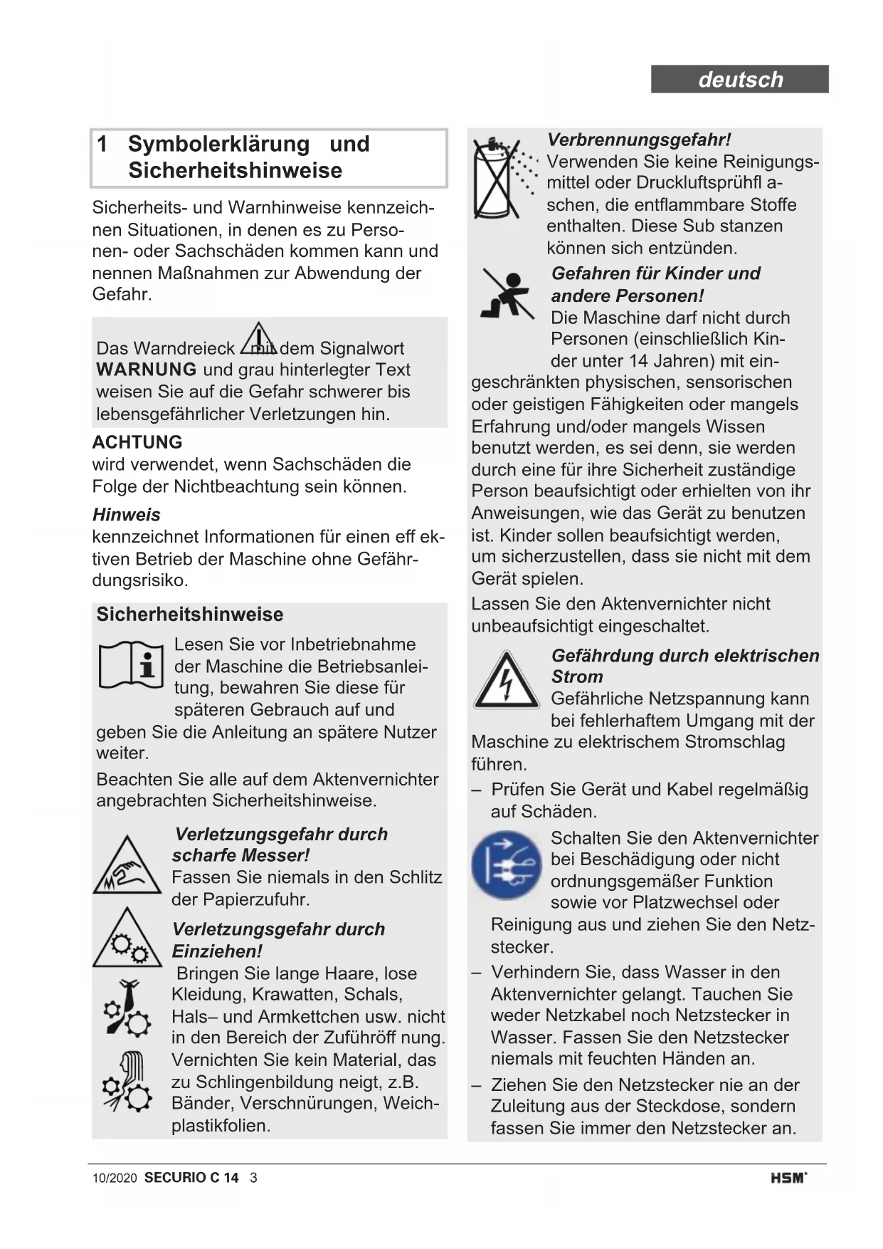 SECURIO C14 碎纸机 . . . . . . . . . . . . . . . . . . . . . . . . . . . . . . . . . . . . . . . . . . . . . . . 128 137 . . . . . . . . . . . . . . . . . . . . . . . . . . . . . . . . . . . . . . . . . . . SECURIO C14 قروﻟا ﺔﻣرﻔﻣ :ﺔﯾﺑرﻌﻟا10/2020 SECURIO C 14 3 1 Symbolerklärung und Sicherheitshinweise Sicherheits- und Warnhinweise kennzeich- nen Situationen, in denen es zu Perso- nen- oder Sachschäden kommen kann und nennen Maßnahmen zur Abwendung der Gefahr. Hinweis kennzeichnet Informationen für einen eff ek- tiven Betrieb der Maschine ohne Gefähr- dungsrisiko. Das Warndreieck mit dem Signalwort WARNUNG und grau hinterlegter Text weisen Sie auf die Gefahr schwerer bis lebensgefährlicher Verletzungen hin. ACHTUNG wird verwendet, wenn Sachschäden die Folge der Nichtbeachtung sein können. Sicherheitshinweise Lesen Sie vor Inbetriebnahme der Maschine die Betriebsanlei- tung, bewahren Sie diese für späteren Gebrauch auf und geben Sie die Anleitung an spätere Nutzer weiter. Beachten Sie alle auf dem Aktenvernichter angebrachten Sicherheitshinweise. Verletzungsgefahr durch scharfe Messer! Fassen Sie niemals in den Schlitz der Papierzufuhr. Verletzungsgefahr durch Einziehen! Bringen Sie lange Haare, lose Kleidung, Krawatten, Schals, Hals– und Armkettchen usw. nicht in den Bereich der Zuführöff nung. Vernichten Sie kein Material, das zu Schlingenbildung neigt, z.B. Bänder, Verschnürungen, Weich- plastikfolien. Verbrennungsgefahr! Verwenden Sie keine Reinigungs- mittel oder Druckluftsprühfl a- schen, die entfl ammbare Stoff e enthalten. Diese Sub stanzen können sich entzünden. Gefahren für Kinder und andere Personen! Die Maschine darf nicht durch Personen (einschließlich Kin- der unter 14 Jahren) mit ein- geschränkten physischen, sensorischen oder geistigen Fähigkeiten oder mangels Erfahrung und/oder mangels Wissen benutzt werden, es sei denn, sie werden durch eine für ihre Sicherheit zuständige Person beaufsichtigt oder erhielten von ihr Anweisungen, wie das Gerät zu benutzen ist. Kinder sollen beaufsichtigt werden, um sicherzustellen, dass sie nicht mit dem Gerät spielen. Lassen Sie den Aktenvernichter nicht unbeaufsichtigt eingeschaltet. Gefährdung durch elektrischen Strom Gefährliche Netzspannung kann bei fehlerhaftem Umgang mit der Maschine zu elektrischem Stromschlag führen. – Prüfen Sie Gerät und Kabel regelmäßig auf Schäden. Schalten Sie den Aktenvernichter bei Beschädigung oder nicht ordnungsgemäßer Funktion sowie vor Platzwechsel oder Reinigung aus und ziehen Sie den Netz- stecker. – Verhindern Sie, dass Wasser in den Aktenvernichter gelangt. Tauchen Sie weder Netzkabel noch Netzstecker in Wasser. Fassen Sie den Netzstecker niemals mit feuchten Händen an. – Ziehen Sie den Netzstecker nie an der Zuleitung aus der Steckdose, sondern fassen Sie immer den Netzstecker an. deutsch4 SECURIO C 14 10/2020 3 Übersicht 4 Lieferumfang