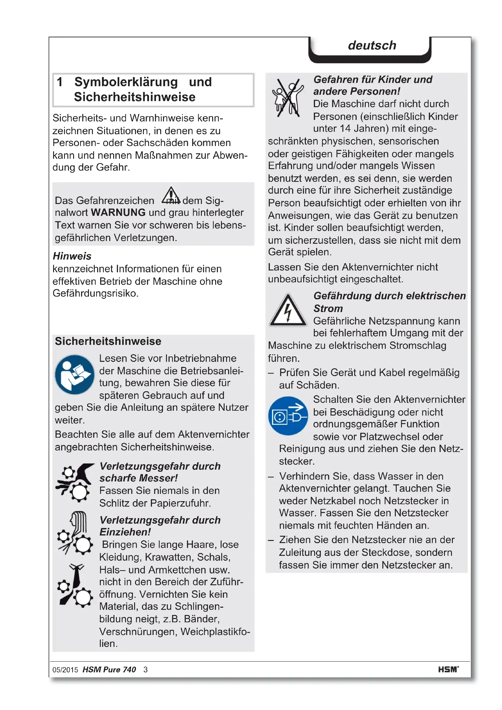 - türkçe: Evrak İmha Makinesi HSM Pure 740 5/2015 HSM Pure 740 3 deutsch 1 Symbolerklärung und Sicherheitshinweise Sicherheits- und Warnhinweise kenn- zeichnen Situationen, in denen es zu Personen- oder Sachschäden kommen kann und nennen Maßnahmen zur Abwen- dung der Gefahr. Hinweis kennzeichnet Informationen für einen effektiven Betrieb der Maschine ohne Gefährdungsrisiko. Das Gefahrenzeichen mit dem Sig- nalwort WARNUNG und grau hinterlegter Text warnen Sie vor schweren bis lebens- gefährlichen Verletzungen. Sicherheitshinweise Lesen Sie vor Inbetriebnahme der Maschine die Betriebsanlei- tung, bewahren Sie diese für späteren Gebrauch auf und geben Sie die Anleitung an spätere Nutzer weiter. Beachten Sie alle auf dem Aktenvernichter angebrachten Sicherheitshinweise. Verletzungsgefahr durch scharfe Messer! Fassen Sie niemals in den Schlitz der Papierzufuhr. Verletzungsgefahr durch Einziehen! Bringen Sie lange Haare, lose Kleidung, Krawatten, Schals, Hals– und Armkettchen usw. nicht in den Bereich der Zuführ- öffnung. Vernichten Sie kein Material, das zu Schlingen- bildung neigt, z.B. Bänder, Verschnürungen, Weichplastikfo- lien. Gefahren für Kinder und andere Personen! Die Maschine darf nicht durch Personen (einschließlich Kinder unter 14 Jahren) mit einge- schränkten physischen, sensorischen oder geistigen Fähigkeiten oder mangels Erfahrung und/oder mangels Wissen benutzt werden, es sei denn, sie werden durch eine für ihre Sicherheit zuständige Person beaufsichtigt oder erhielten von ihr Anweisungen, wie das Gerät zu benutzen ist. Kinder sollen beaufsichtigt werden, um sicherzustellen, dass sie nicht mit dem Gerät spielen. Lassen Sie den Aktenvernichter nicht unbeaufsichtigt eingeschaltet. Gefährdung durch elektrischen Strom Gefährliche Netzspannung kann bei fehlerhaftem Umgang mit der Maschine zu elektrischem Stromschlag führen. – Prüfen Sie Gerät und Kabel regelmäßig auf Schäden. Schalten Sie den Aktenvernichter bei Beschädigung oder nicht ordnungsgemäßer Funktion sowie vor Platzwechsel oder Reinigung aus und ziehen Sie den Netz- stecker. – Verhindern Sie, dass Wasser in den Aktenvernichter gelangt. Tauchen Sie weder Netzkabel noch Netzstecker in Wasser. Fassen Sie den Netzstecker niemals mit feuchten Händen an. – Ziehen Sie den Netzstecker nie an der Zuleitung aus der Steckdose, sondern fassen Sie immer den Netzstecker an.4 HSM Pure 740 05/2015 deutsch p. 1500
