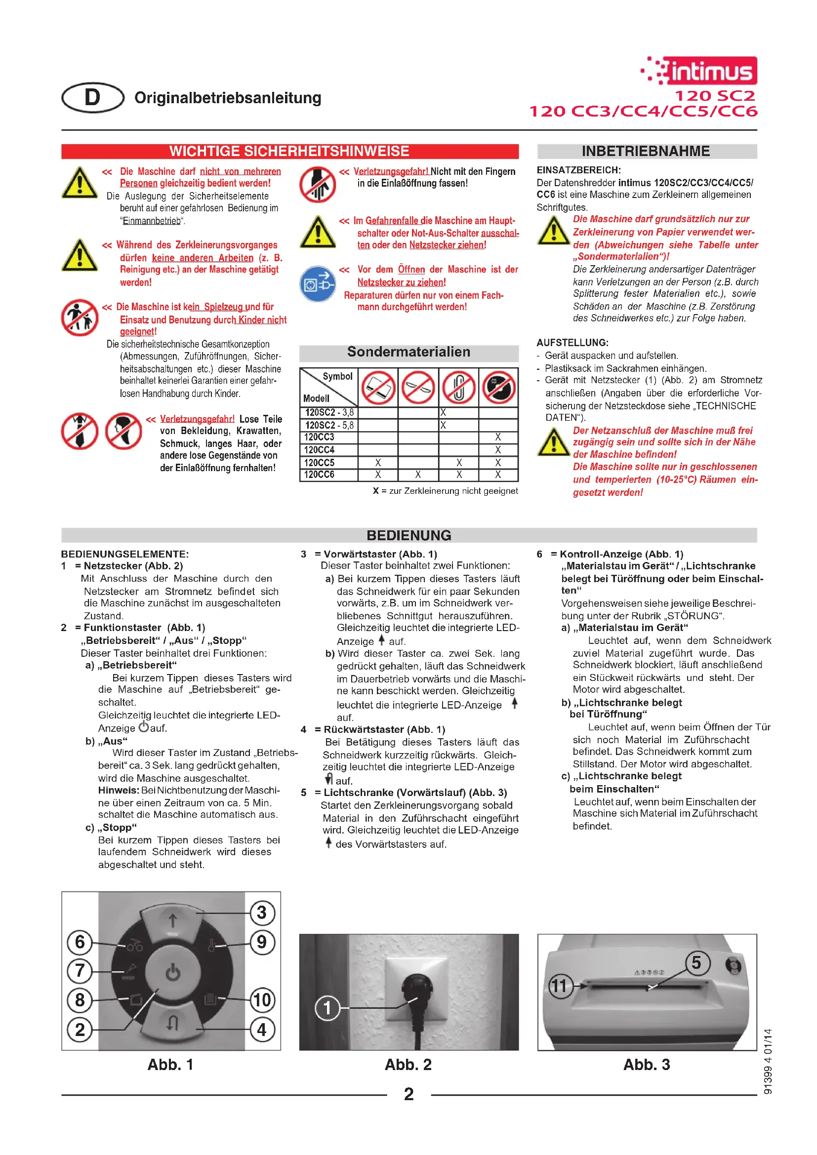 (Seite 2-4) (page 5-7) (page 8-10) (pagina 11-13) (página 14-16) (página 17-19) (pagina 20-22) (Σελίδα23-25) (side 26-28) (side 29-31) (sidan 32-34) (sivulla 35-37) (Strona 38-40) (Strana 41-43) (Oldal 44-46) (стpаници 47-49) (стpаницы 50-52) RUS Betriebsanleitung Operating Instructions Instructions d’opération Gebruiksaanwijzing Instrucciones de uso Instruções de Operação Istruzioni per l’uso Οδηγίεςχρήσης Betjeningsvejledning Bruksveiledning Bruksanvisningen Käyttöohjeet Instrukcjaobsługi Návodkobsluze Kezelésiutasítás Инструкция за експлоатация Инстpyкция по обслyживанию 91399 4 01/14120 SC2 120 CC3/CC4/CC5/CC6 EINSATZBEREICH: Der Datenshredder intimus 120SC2/CC3/CC4/CC5/ CC6 ist eine Maschine zum Zerkleinern allgemeinen Schriftgutes. Die Maschine darf grundsätzlich nur zur Zerkleinerung von Papier verwendet wer- den (Abweichungen siehe Tabelle unter „Sondermaterialien“)! Die Zerkleinerung andersartiger Datenträger kann Verletzungen an der Person (z.B. durch Splitterung fester Materialien etc.), sowie Schäden an der Maschine (z.B. Zerstörung des Schneidwerkes etc.) zur Folge haben. AUFSTELLUNG: - Gerät auspacken und aufstellen. - Plastiksack im Sackrahmen einhängen. - Gerät mit Netzstecker (1) (Abb. 2) am Stromnetz anschließen (Angaben über die erforderliche Vor- sicherung der Netzsteckdose siehe „TECHNISCHE DATEN“). Der Netzanschluß der Maschine muß frei zugängig sein und sollte sich in der Nähe der Maschine benden! Die Maschine sollte nur in geschlossenen und temperierten (10-25°C) Räumen ein- gesetzt werden! WICHTIGE SICHERHEITSHINWEISE << Verletzungsgefahr! Nicht mit den Fingern in die Einlaßöffnung fassen! << Im Gefahrenfalle die Maschine am Haupt- schalter oder Not-Aus-Schalter ausschal- ten oder den Netzstecker ziehen! << Vor dem Öffnen der Maschine ist der Netzstecker zu ziehen! Reparaturen dürfen nur von einem Fach- mann durchgeführt werden! << Die Maschine darf nicht von mehreren Personen gleichzeitig bedient werden! Die Auslegung der Sicherheitselemente beruht auf einer gefahrlosen Bedienung im “Einmannbetrieb“. << Während des Zerkleinerungsvorganges dürfen keine anderen Arbeiten (z. B. Reinigung etc.) an der Maschine getätigt werden! << Die Maschine ist kein Spielzeug und für Einsatz und Benutzung durch Kinder nicht geeignet! Die sicherheitstechnische Gesamtkonzeption (Abmessungen, Zuführöffnungen, Sicher- heitsabschaltungen etc.) dieser Maschine beinhaltet keinerlei Garantien einer gefahr- losen Handhabung durch Kinder. << Verletzungsgefahr! Lose Teile von Bekleidung, Krawatten, Schmuck, langes Haar, oder andere lose Gegenstände von der Einlaßöffnung fernhalten! 120SC2 - 3,8 X 120SC2 - 5,8 X 120CC3 X 120CC4 X 120CC5 X X X 120CC6 X X X X