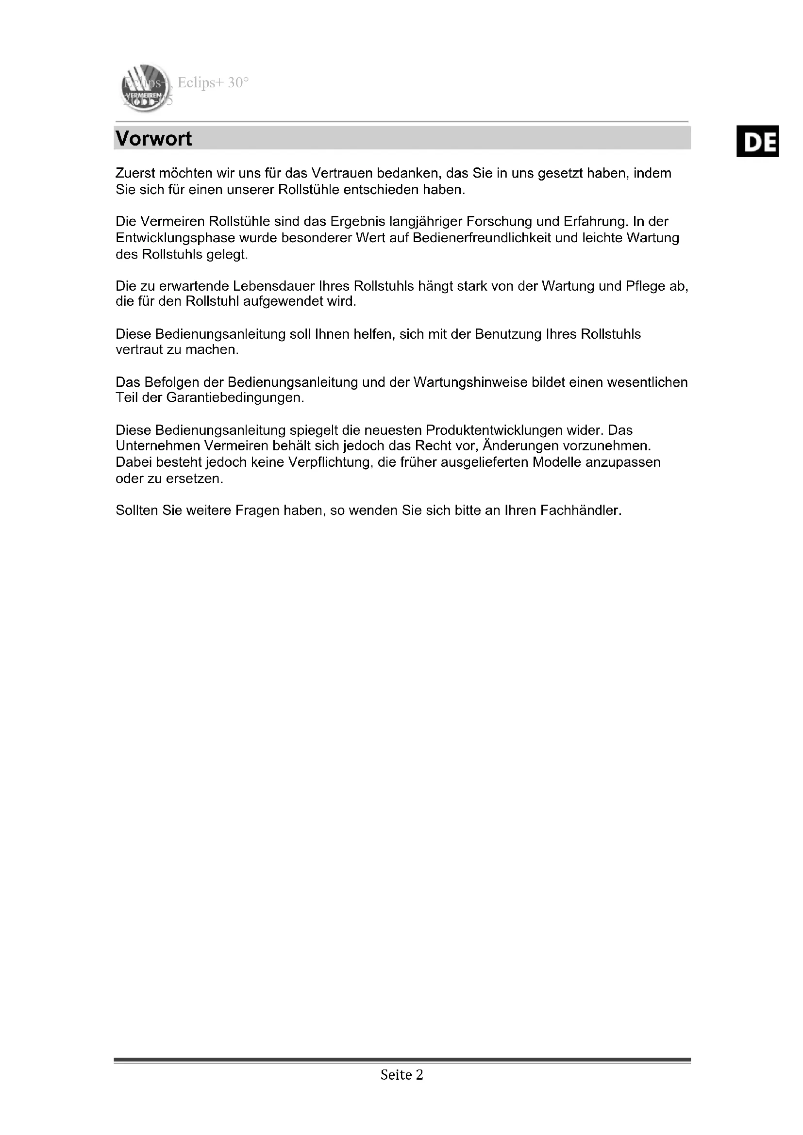 Vorwort Zuerst möchten wir uns für das Vertrauen bedanken, das Sie in uns gesetzt haben, indem Sie sich für einen unserer Rollstühle entschieden haben. Die Vermeiren Rollstühle sind das Ergebnis langjähriger Forschung und Erfahrung. In der Entwicklungsphase wurde besonderer Wert auf Bedienerfreundlichkeit und leichte Wartung des Rollstuhls gelegt. Die zu erwartende Lebensdauer Ihres Rollstuhls hängt stark von der Wartung und Pflege ab, die für den Rollstuhl aufgewendet wird. Diese Bedienungsanleitung soll Ihnen helfen, sich mit der Benutzung Ihres Rollstuhls vertraut zu machen. Das Befolgen der Bedienungsanleitung und der Wartungshinweise bildet einen wesentlichen Teil der Garantiebedingungen. Diese Bedienungsanleitung spiegelt die neuesten Produktentwicklungen wider. Das Unternehmen Vermeiren behält sich jedoch das Recht vor, Änderungen vorzunehmen. Dabei besteht jedoch keine Verpflichtung, die früher ausgelieferten Modelle anzupassen oder zu ersetzen. Sollten Sie weitere Fragen haben, so wenden Sie sich bitte an Ihren Fachhändler.Eclips+, Eclips+ 30° 2011-05 Seite 3