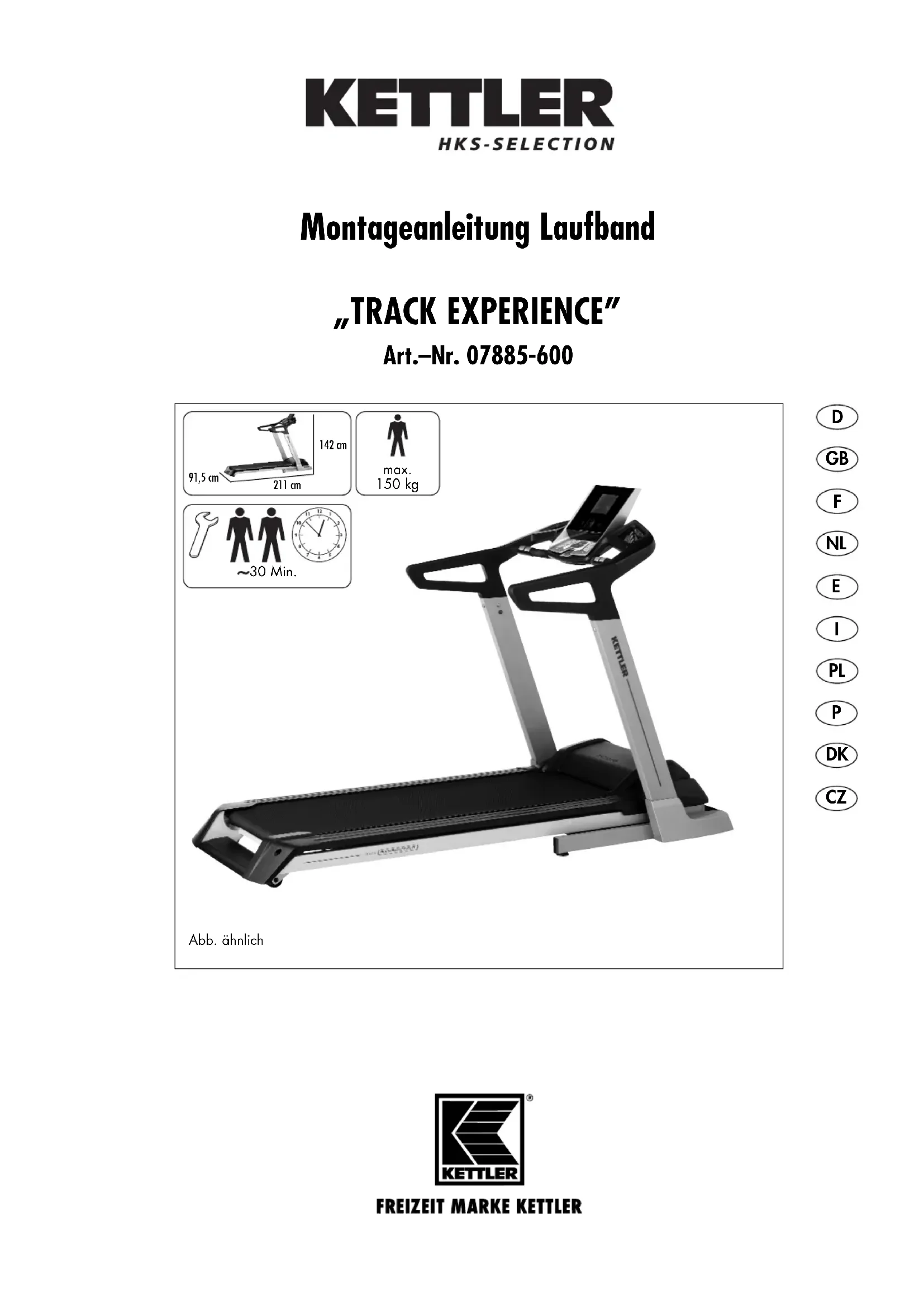 Zur Pflege und Wartung ■ Verwenden Sie zur regelmäßigen Säuberung, Pflege und War- tung unser speziell für KETTLER-Sportgeräte freigegebenes Geräte-Pflege-Set (Art.-Nr. 07921-000), welches Sie über den Sportfachhandel beziehen können. ■ Die elektrischen Teile und Baugruppen des Laufbandes sind wartungsarm. Es besteht keine Veranlassung, in diesen Teil des Gerätes einzugreifen. Ausgenommen sind Reparaturen oder Wartungschecks durch qualifiziertes Fachpersonal. ■ Bewahren Sie die Originalverpackung des Gerätes gut auf, da- mit sie später u. U. als Transportverpackung verwendet werden kann. Warenretouren sind nur nach Absprache und mit trans- portsicherer (Innen-)Verpackung, möglichst im Originalkarton vorzunehmen. Wichtig ist eine detaillierte Fehlerbeschrei- bung/Schadensmeldung! ■ Für Ersatzteilbestellungen benutzen Sie bitte die Ersatzteil - stückliste. Geben Sie bei Ersatzteilbestellungen bitte immer die vollständige Artikelnummer, die Ersatzteilbestellnummer, die benötigte Stückzahl sowie die Seriennummer des Gerätes an. Bestellbeispiel: „Artikelnummer 07885-600/ Ersatzteilnr. 68006220 / 1 Stück / Seriennummer ...“ Wichtig: Zu verschraubende Ersatzteile werden grundsätzlich ohne Verschraubungsmaterial berechnet und geliefert. Falls Be- darf an entsprechendem Verschraubungsmaterial besteht, ist die- se durch den Zusatz „mit Verschraubungsmaterial“ bei der Er- satzteilbestellung anzugeben. Entsorgungshinweis KETTLER-Produkte sind recyclebar. Führen Sie das Gerät am Ende der Nutzungsdauer einer sachge- rechten Entsorgung zu (ortliche Sammelstelle). DE 60229750 Montagehinweise WARNUNG! Sorgen Sie für eine gefahrenfreie Arbeis - umgebung, lassen Sie z. B. kein Werkzeug umherliegen. Deponieren Sie z. B. Verpackungsmaterial so, dass keine Gefahren davon ausgehen kann. Bei Folien/Kunststofftüten für Kinder Erstickungsgefahr! ■ Bitte prüfen Sie, ob alle zum Lieferumfang gehörenden Teile vorhanden sind (s. Checkliste) und ob Transportschäden vor- liegen. Sollte es Anlass für Beanstandungen geben, wenden Sie sich bitte an Ihren Fachhändler. ■ Sehen Sie sich die Zeichnungen in Ruhe an, und montieren Sie das Gerät entsprechend der Bilderfolge. Innerhalb der einzel- nen Abbildungen ist der Montageablauf durch Großbuch- staben vorgegeben. ■ Beachten Sie, dass bei jeder Benutzung von Werkzeug und bei handwerklichen Tätigkeiten immer eine mögliche Verlet-