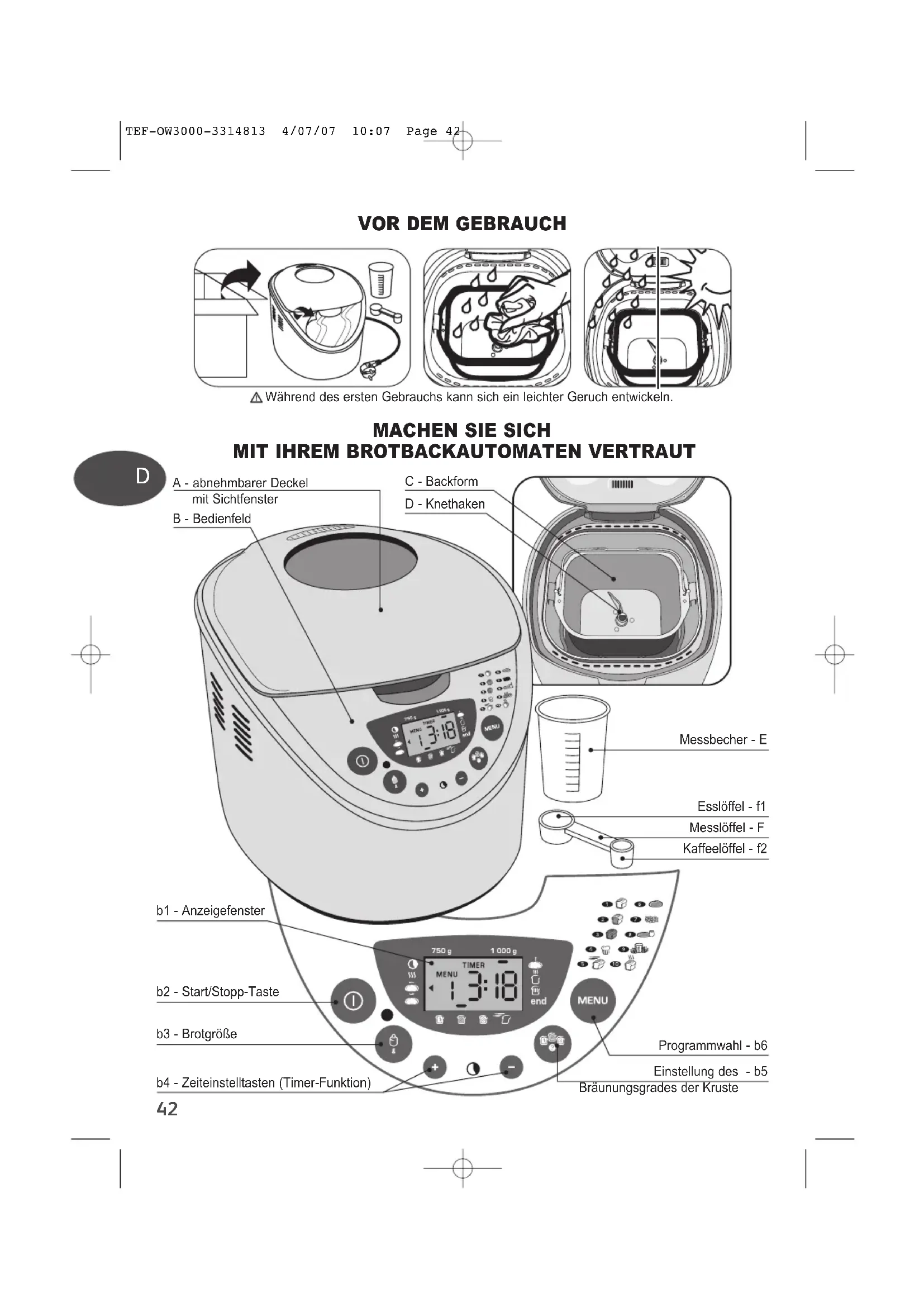 A - abnehmbarer Deckel mit Sichtfenster B - Bedienfeld b3 - Brotgröße b2 - Start/Stopp-Taste b4 - Zeiteinstelltasten (Timer-Funktion) Messbecher - E Esslöffel - f1 Messlöffel - F Kaffeelöffel - f2 C - Backform D - Knethaken Programmwahl - b6 Einstellung des - b5 Bräunungsgrades der Kruste b1 - Anzeigefenster Während des ersten Gebrauchs kann sich ein leichter Geruch entwickeln. TEF-OW3000-3314813 4/07/07 10:07 Page 4243 VORWORT Brot spielt in unserer Ernährung eine große Rolle. Wer wünscht sich nicht, sein eigenes Brot zu backen? Mit diesem Brotbackautomaten geht Ihr Wunsch in Erfüllung. Ob Back-Neuling oder bereits Experte, Sie füllen einfach die Zutaten ein und schalten den Brotbackautomaten ein. Er erledigt den Rest. Sie können Brot, Hefegebäck, Teige und auch Marmelade ohne weiteres Zutun herstellen. Etwas Aufmerksamkeit ist allerdings erforderlich, um sich mit dem Gerätebetrieb vertraut zu machen. Nehmen Sie sich diese Zeit und seien Sie nicht gleich enttäuscht, wenn die ersten Versuche nicht auf Anhieb gelingen. Mit dem Rezept im Abschnitt "Schnellanleitung" kön- nen auch Ungeduldige die ersten Brotbackschritte machen. Achten Sie bitte darauf, dass das selbstge- machte Brot kompakter ist als das vom Bäcker.