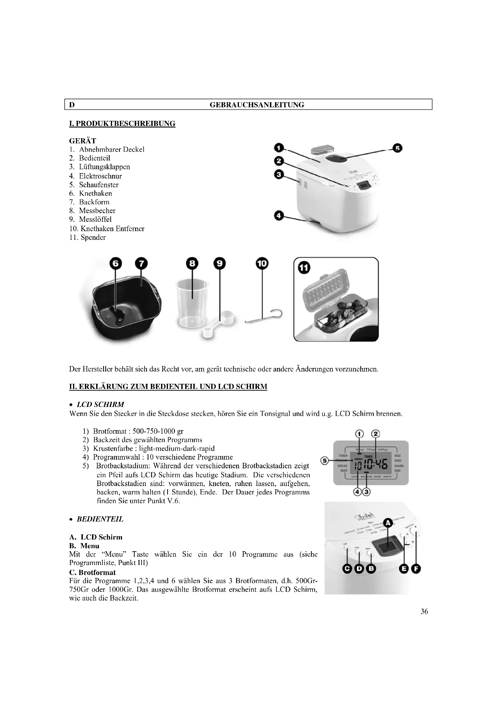 Während dem Gebrauch sind das Schaufenster und Backform sehr warm.itte immer Backformhandschuhe anziehen um das Schaufenster anzurühren und immer Backformhandschuhe anziehen um die Backform vom Gerät zu entfern, und um das Brot vom Backform zu entfern. Achting beim herauszichen des Knethaken.
