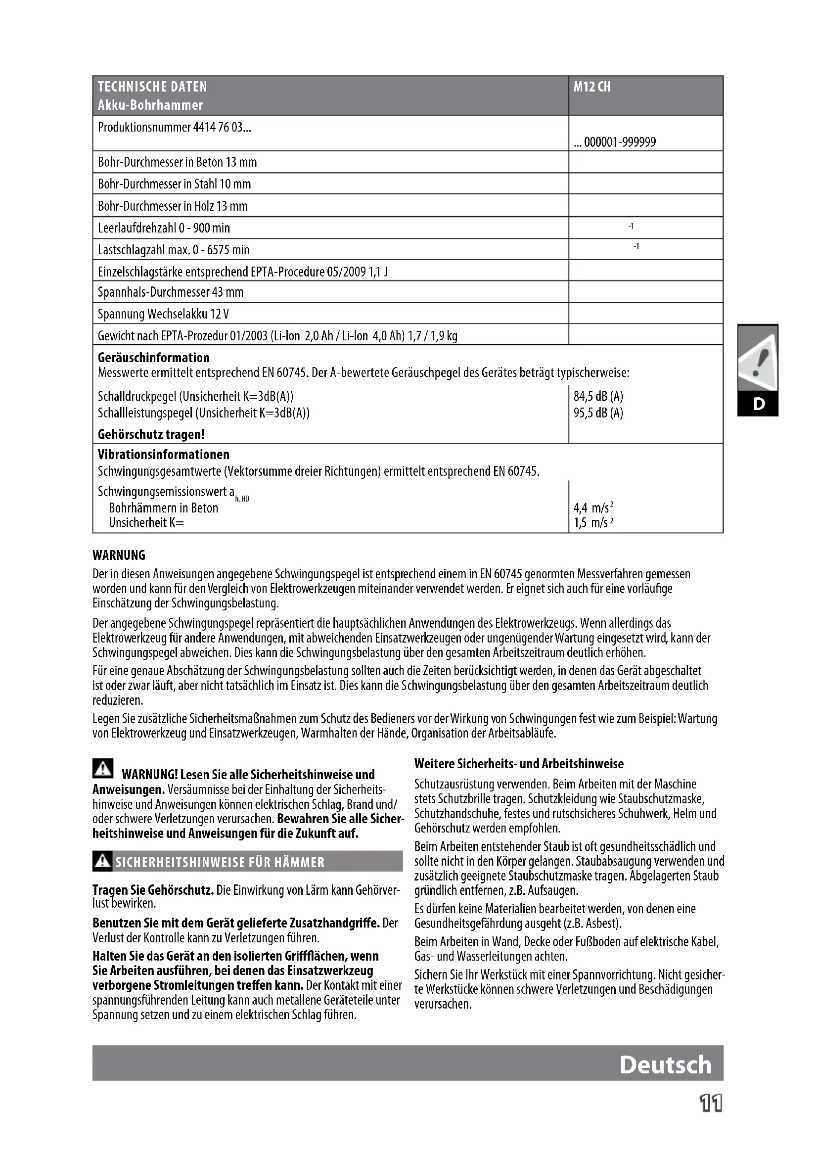 Tragen Sie Gehörschutz. Die Einwirkung von Lärm kann Gehörver- lust bewirken. Benutzen Sie mit dem Gerät gelieferte Zusatzhandgrie. Der Verlust der Kontrolle kann zu Verletzungen führen. Halten Sie das Gerät an den isolierten Griächen, wenn Sie Arbeiten ausführen, bei denen das Einsatzwerkzeug verborgene Stromleitungen treen kann. Der Kontakt mit einer spannungsführenden Leitung kann auch metallene Geräteteile unter Spannung setzen und zu einem elektrischen Schlag führen. Weitere Sicherheits- und Arbeitshinweise Schutzausrüstung verwenden. Beim Arbeiten mit der Maschine stets Schutzbrille tragen. Schutzkleidung wie Staubschutzmaske, Schutzhandschuhe, festes und rutschsicheres Schuhwerk, Helm und Gehörschutz werden empfohlen. Beim Arbeiten entstehender Staub ist oft gesundheitsschädlich und sollte nicht in den Körper gelangen. Staubabsaugung verwenden und zusätzlich geeignete Staubschutzmaske tragen. Abgelagerten Staub gründlich entfernen, z.B. Aufsaugen. Es dürfen keine Materialien bearbeitet werden, von denen eine Gesundheitsgefährdung ausgeht (z.B. Asbest). Beim Arbeiten in Wand, Decke oder Fußboden auf elektrische Kabel, Gas- und Wasserleitungen achten. Sichern Sie Ihr Werkstück mit einer Spannvorrichtung. Nicht gesicher- te Werkstücke können schwere Verletzungen und Beschädigungen verursachen. TECHNISCHE DATEN Akku-Bohrhammer M12 CH Produktionsnummer 4414 76 03... ... 000001-999999 Bohr-Durchmesser in Beton 13 mm Bohr-Durchmesser in Stahl 10 mm Bohr-Durchmesser in Holz 13 mm Leerlaufdrehzahl 0 - 900 min