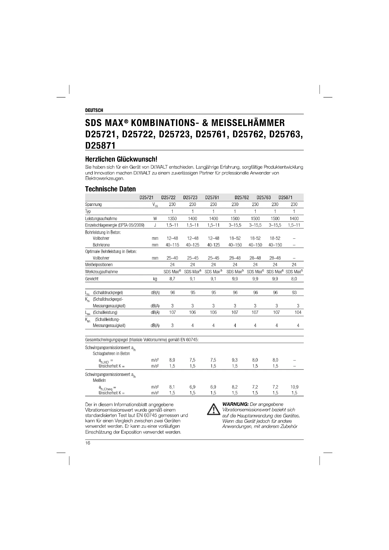 D25721, D25722, D25723, D25761, D25762, D25763, D25871 Herzlichen Glückwunsch! Sie haben sich für ein Gerät von DEWALT entschieden. Langjährige Erfahrung, sorgfältige Produktentwicklung und Innovation machen DEWALT zu einem zuverlässigen Partner für professionelle Anwender von Elektrowerkzeugen. Technische Daten D25721 D25722 D25723 D25761 D25762 D25763 D25871 Spannung V