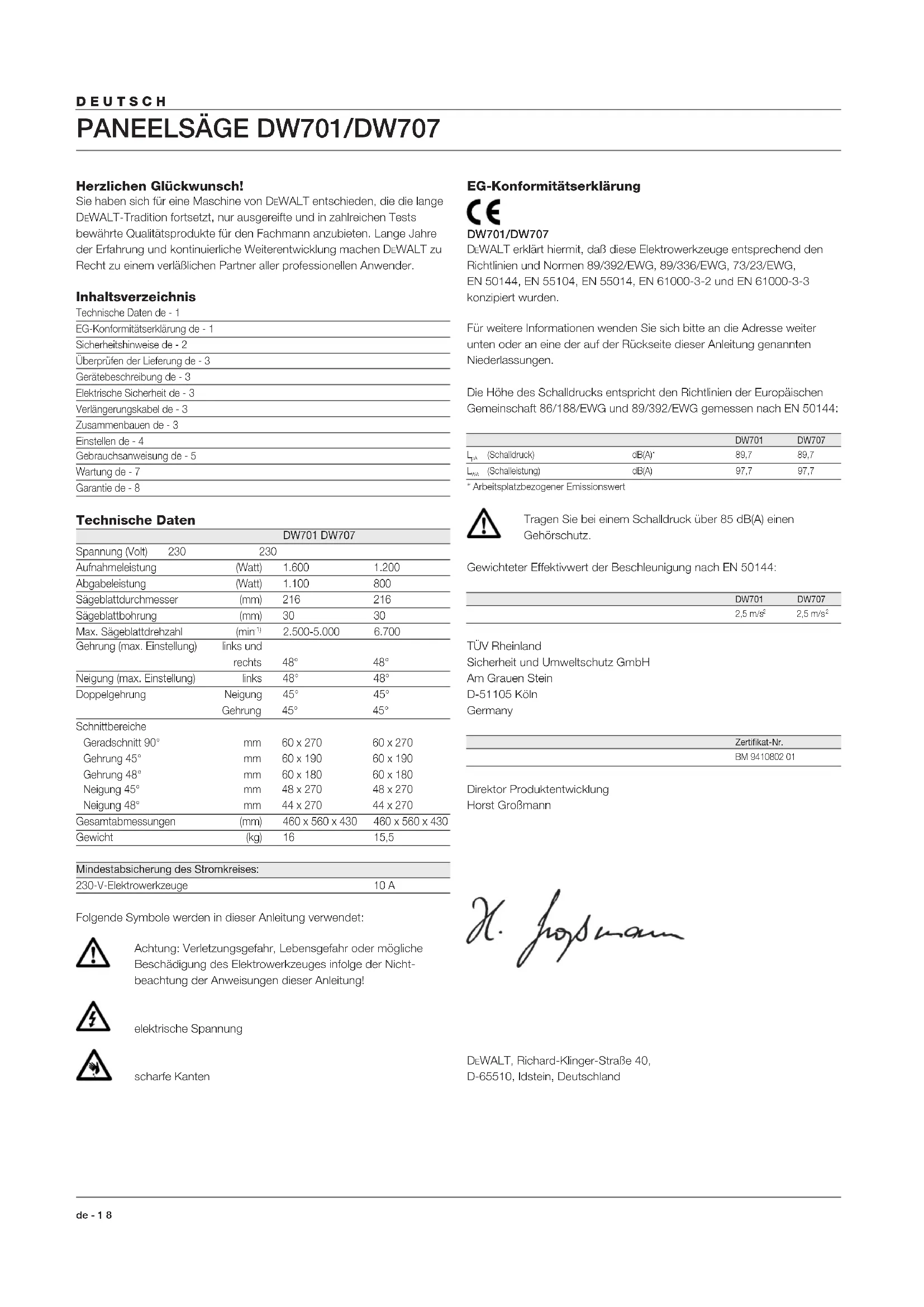 EWALT erklärt hiermit, daß diese Elektrowerkzeuge entsprechend den Richtlinien und Normen 89/392/EWG, 89/336/EWG, 73/23/EWG, EN 50144, EN 55104, EN 55014, EN 61000-3-2 und EN 61000-3-3 konzipiert wurden. Für weitere Informationen wenden Sie sich bitte an die Adresse weiter unten oder an eine der auf der Rückseite dieser Anleitung genannten Niederlassungen. Die Höhe des Schalldrucks entspricht den Richtlinien der Europäischen Gemeinschaft 86/188/EWG und 89/392/EWG gemessen nach EN 50144: DW701 DW707