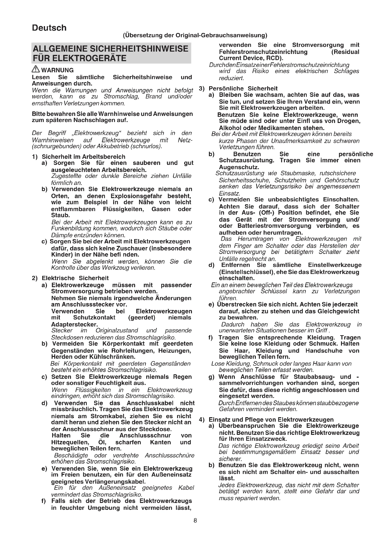 WARNUNG Lesen Sie sämtliche Sicherheitshinweise und Anweisungen durch. Wenn die Warnungen und Anweisungen nicht befolgt werden, kann es zu Stromschlag, Brand und/oder ernsthaften Verletzungen kommen. Bitte bewahren Sie alle Warnhinweise und Anweisungen zum späteren Nachschlagen auf. Der Begriff „Elektrowerkzeug“ bezieht sich in den Warnhinweisen auf Elektrowerkzeuge mit Netz- (schnurgebunden) oder Akkubetrieb (schnurlos).