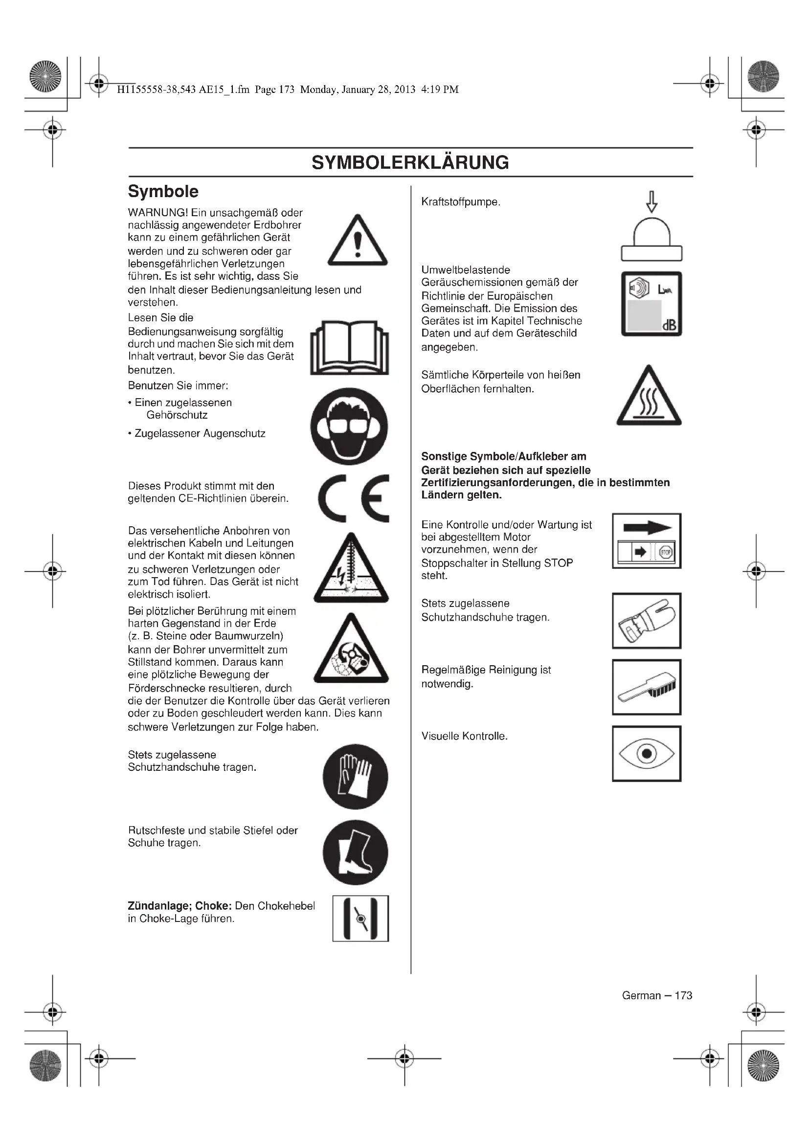WARNING! Ein unsachgemäß oder nachlüssig angewendeter Erdbohrer kann zu einem gefährlichen Gerät werden und zu schweren oder gar lebensgefährlichen Verletzungen führen. Es ist sehr wichtig, dass Sie den Inhalt dieser Bedienungsanleitunglesen und verstehen.