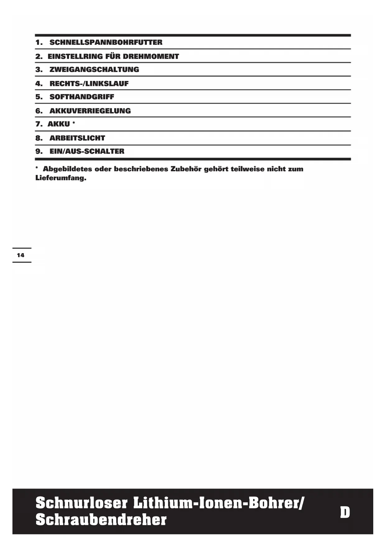 - Abgebildetes oder beschriebenes Zubehör gehört teilweise nicht zum Lieferumfang.15 Schnurloser Lithium-Ionen-Bohrer/ Schraubendreher