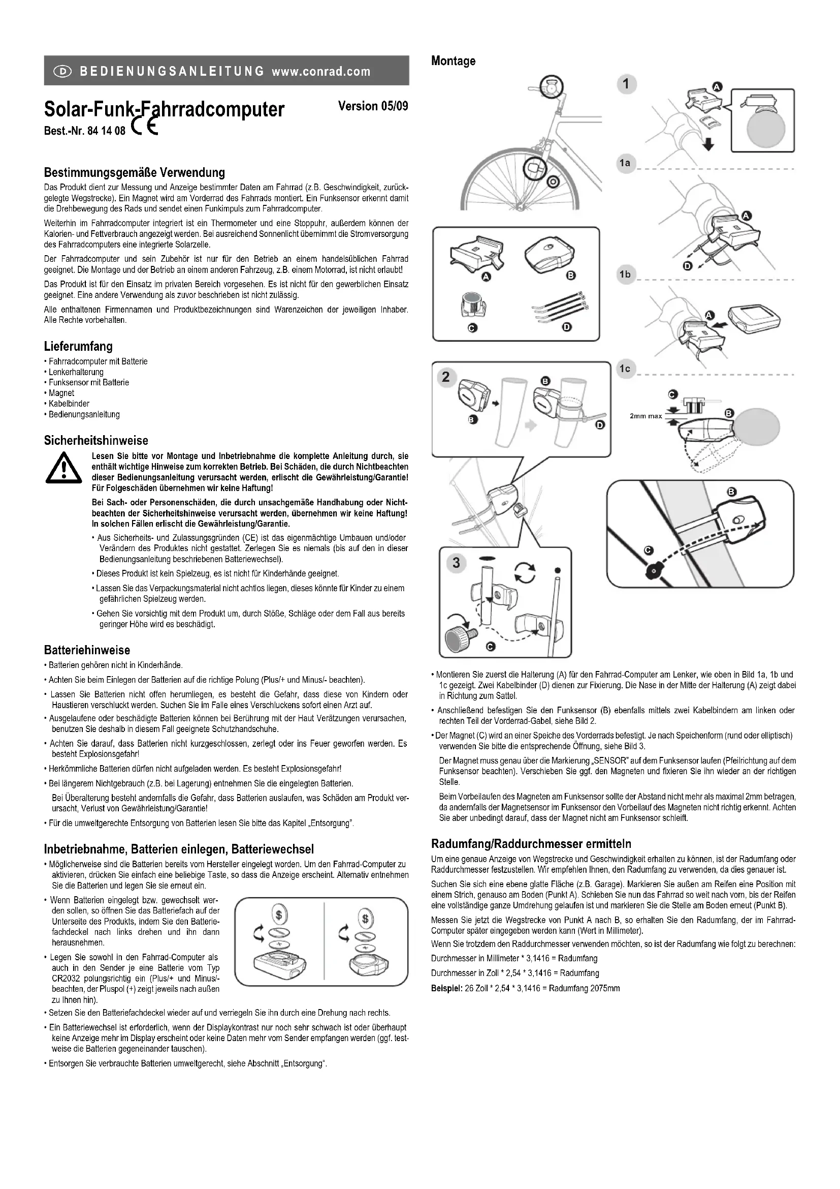 Solar-Funk-Fahrradcomputer Version 05/09 Best.-Nr. 84 14 08 ° Bestimmungsgemäße Verwendung Das Produkt dient zur Messung und Anzeige bestimmter Daten am Fahrrad (z.B. Geschwindigkeit, zurück-gelegte Wegstrecke). Ein Magnet wird am Vorderrad des Fahrrads montiert. Ein Funksensor erkennt damitdie Drehbewegung des Rads und sendet einen Funkimpuls zum Fahrradcomputer. Weiterhin im Fahrradcomputer integriert ist ein Thermometer und eine Stoppuhr, außerdem können derKalorien- und Fettverbrauch angezeigt werden. Bei ausreichend Sonnenlicht übernimmt die Stromversorgungdes Fahrradcomputers eine integrierte Solarzelle.Der Fahrradcomputer und sein Zubehör ist nur für den Betrieb an einem handelsüblichen Fahrrad geeignet. Die Montage und der Betrieb an einem anderen Fahrzeug, z.B. einem Motorrad, ist nicht erlaubt!Das Produkt ist für den Einsatz im privaten Bereich vorgesehen. Es ist nicht für den gewerblichen Einsatzgeeignet. Eine andere Verwendung als zuvor beschrieben ist nicht zulässig.Alle enthaltenen Firmennamen und Produktbezeichnungen sind Warenzeichen der jeweiligen Inhaber. Alle Rechte vorbehalten. Lieferumfang