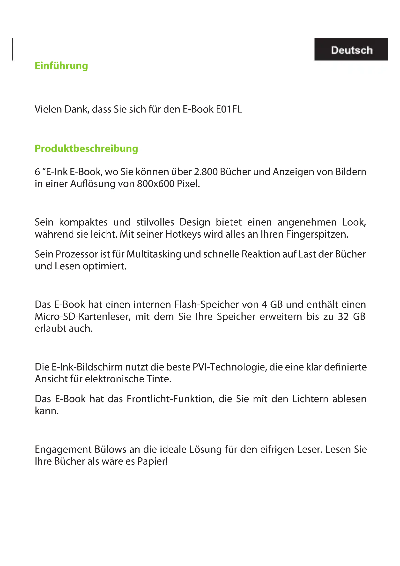 Z hlavního menu, zvolte možnost Ručně a stiskněte klávesu Enter. Návod k použití eBook otevře Technická podpora Pro více informací o tomto produktu, prosím navštivte naši sekci podpory na našich webových stránkách www.billowtechnology.com nebo pošlete e-mail na support@billowtechnology.comEinführung Vielen Dank, dass Sie sich für den E-Book E01FL Produktbeschreibung 6 “E-Ink E-Book, wo Sie können über 2.800 Bücher und Anzeigen von Bildern in einer Auösung von 800x600 Pixel. Sein kompaktes und stilvolles Design bietet einen angenehmen Look, während sie leicht. Mit seiner Hotkeys wird alles an Ihren Fingerspitzen. Sein Prozessor ist für Multitasking und schnelle Reaktion auf Last der Bücher und Lesen optimiert. Das E-Book hat einen internen Flash-Speicher von 4 GB und enthält einen Micro-SD-Kartenleser, mit dem Sie Ihre Speicher erweitern bis zu 32 GB erlaubt auch. Die E-Ink-Bildschirm nutzt die beste PVI-Technologie, die eine klar denierte Ansicht für elektronische Tinte. Das E-Book hat das Frontlicht-Funktion, die Sie mit den Lichtern ablesen kann. Engagement Bülows an die ideale Lösung für den eifrigen Leser. Lesen Sie Ihre Bücher als wäre es Papier!Packungsinhalt -E01FL -Schnellinstallationsanleitung -Mini-USB-Kabel Hinweis Stellen Sie sicher, dass Ihr Paket enthält die oben beschriebenen Gegenstände. Wenn Sie feststellen, Teile fehlen oder beschädigt sind, wenden Sie sich bitte an Ihren Händler. Systemanforderungen -1 USB 2.0-Anschluss -Betriebssystem Windows Teilebeschreibung