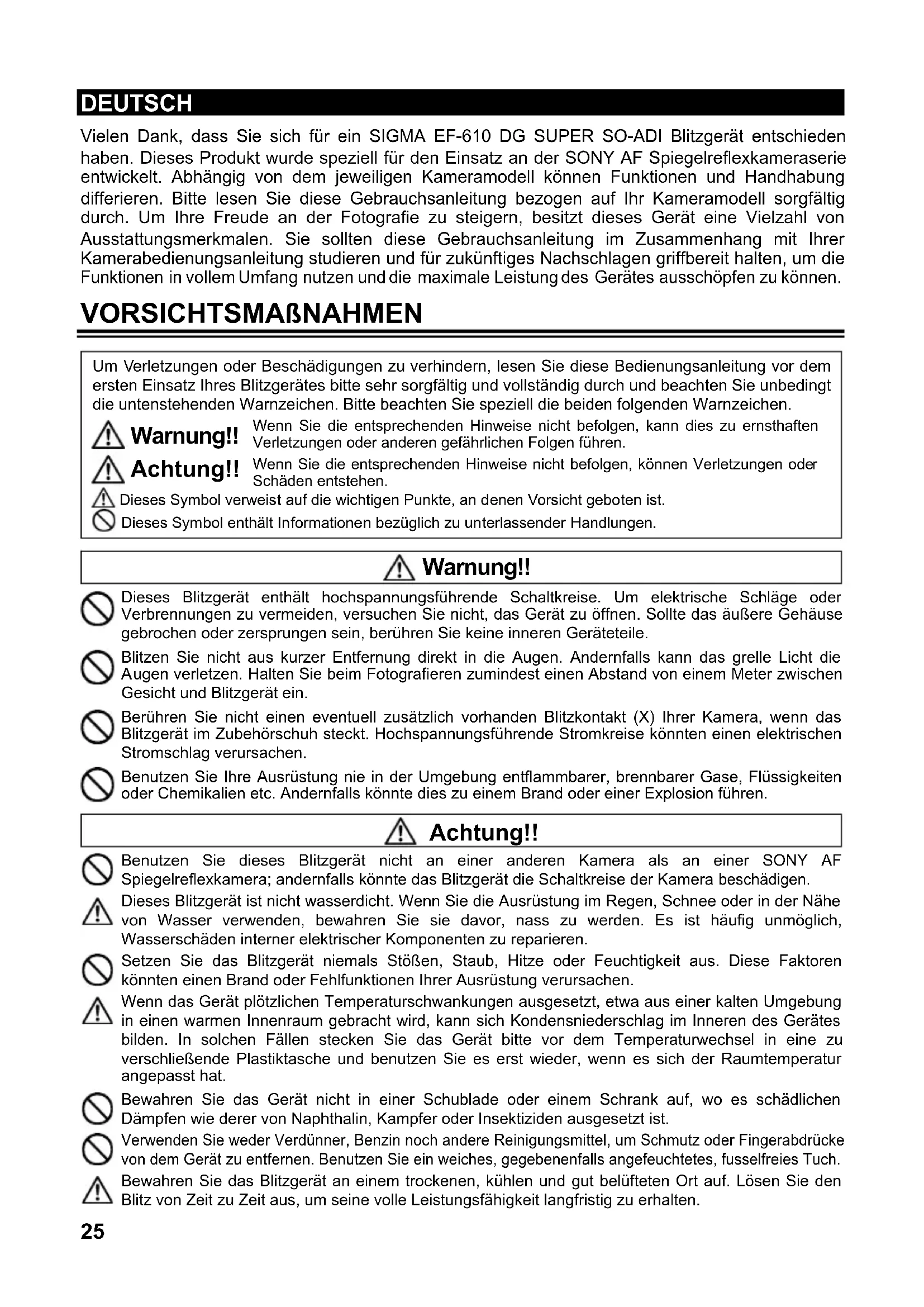 : about 160 flashes (Ni-Cd, Ni-MH Nickel-Metal Hydride) FLASH DURATION : about 1 / 700 sec. (full power firing) FLASH ILLUMINATE ANGLE : 24~105mm motor powered control (17mm with Built-in Wide Panel) AUTO POWER OFF : Available WEIGHT : 330g / 11.6oz. DIMENSIONS : 77mm (W) / 3.0in. x 139mm (H) / 5.5in. x 117mm (L) / 4.6in.25 DEUTSCH Vielen Dank, dass Sie sich für ein SIGMA EF-610 DG SUPER SO-ADI Blitzgerät entschieden haben. Dieses Produkt wurde speziell für den Einsatz an der SONY AF Spiegelreflexkameraserie entwickelt. Abhängig von dem jeweiligen Kameramodell können Funktionen und Handhabung differieren. Bitte lesen Sie diese Gebrauchsanleitung bezogen auf Ihr Kameramodell sorgfältig durch. Um Ihre Freude an der Fotografie zu steigern, besitzt dieses Gerät eine Vielzahl von Ausstattungsmerkmalen. Sie sollten diese Gebrauchsanleitung im Zusammenhang mit Ihrer Kamerabedienungsanleitung studieren und für zukünftiges Nachschlagen griffbereit halten, um die Funktionen