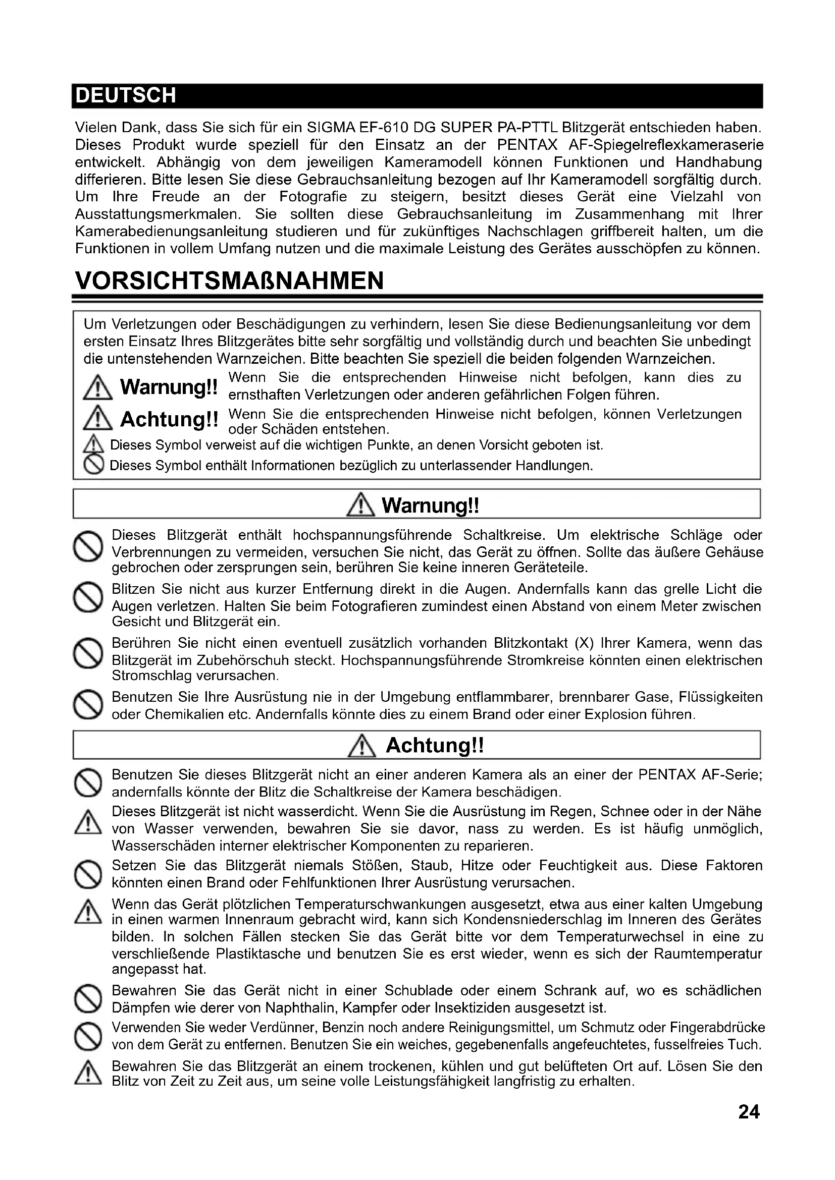 : about 160 flashes (Ni-Cd, Ni-MH Nickel-Metal Hydride) FLASH DURATION : about 1 / 700 sec. (full power firing) FLASH ILLUMINATE ANGLE : 24~105mm motor powered control (17mm with Built-in Wide Panel) AUTO POWER OFF : Available WEIGHT : 330g / 11.6oz. DIMENSIONS : 77mm (W) / 3.0in. x 139mm (H) / 5.5in. x 117mm (L) / 4.6in.24 DEUTSCH Vielen Dank, dass Sie sich für ein SIGMA EF-610 DG SUPER PA-PTTL Blitzgerät entschieden haben. Dieses Produkt wurde speziell für den Einsatz an der PENTAX AF-Spiegelreflexkameraserie entwickelt. Abhängig von dem jeweiligen Kameramodell können Funktionen und Handhabung differieren. Bitte lesen Sie diese Gebrauchsanleitung bezogen auf Ihr Kameramodell sorgfältig durch. Um Ihre Freude an der Fotografie zu steigern, besitzt dieses Gerät eine Vielzahl von Ausstattungsmerkmalen. Sie sollten diese Gebrauchsanleitung im Zusammenhang mit Ihrer Kamerabedienungsanleitung studieren und für zukünftiges Nachschlagen griffbereit halten, um die Funktionen in vollem Umfang nutzen und die maximale Leistung des Gerätes ausschöpfen zu können. VORSICHTSMAßNAHMEN Um Verletzungen oder Beschädigungen zu verhindern, lesen Sie diese Bedienungsanleitung vor dem ersten Einsatz Ihres Blitzgerätes bitte sehr sorgfältig und vollständig durch und beachten Sie unbedingt die untenstehenden Warnzeichen. Bitte beachten Sie speziell die beiden folgenden Warnzeichen. Warnung!! Achtung!! Dieses Symbol verweist auf die wichtigen Punkte, an denen Vorsicht geboten ist. Dieses Symbol enthält Informationen bezüglich zu unterlassender Handlungen. Wenn Sie die entsprechenden Hinweise nicht befolgen, kann dies zuernsthaften Verletzungen oder anderen gefährlichen Folgen führen. Wenn Sie die entsprechenden Hinweise nicht befolgen, können Verletzungenoder Schäden entstehen. Warnung!! Dieses Blitzgerät enthält hochspannungsführende Schaltkreise. Um elektrische Schläge ode