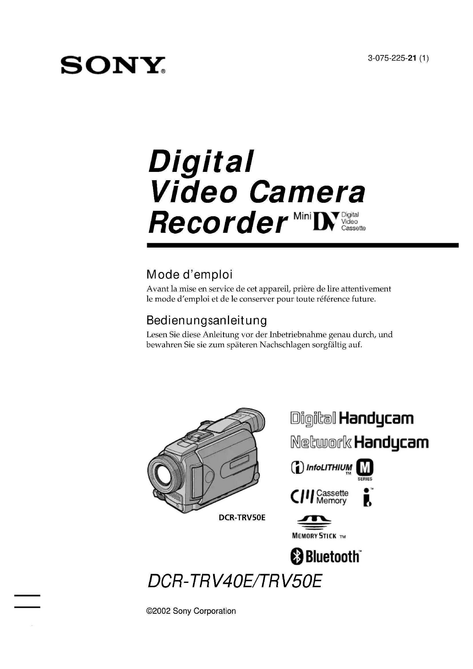 3-075-225-21 (1) ©2002 Sony Corporation Digital Video Camera Recorder ©2002 Sony Corporation Mode d’emploi Avant la mise en service de cet appareil, prière de lire attentivement le mode d’emploi et de le conserver pour toute référence future. Bedienungsanleitung Lesen Sie diese Anleitung vor der Inbetriebnahme genau durch, und bewahren Sie sie zum späteren Nachschlagen sorgfältig auf.