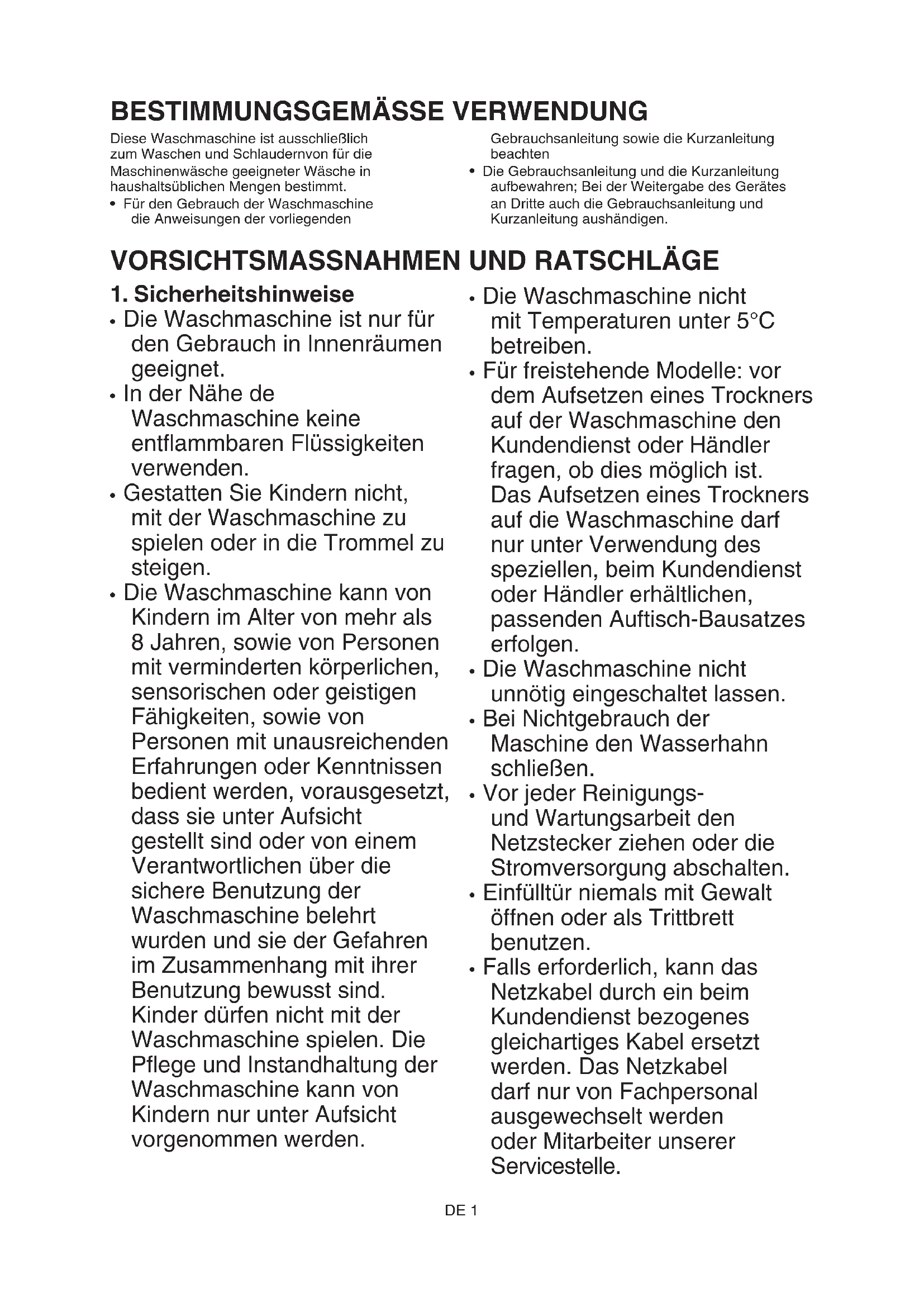 - Für den Gebrauch der Waschmaschine die Anweisungen der vorliegenden Gebrauchsanleitung sowie die Kurzanleitung beachten